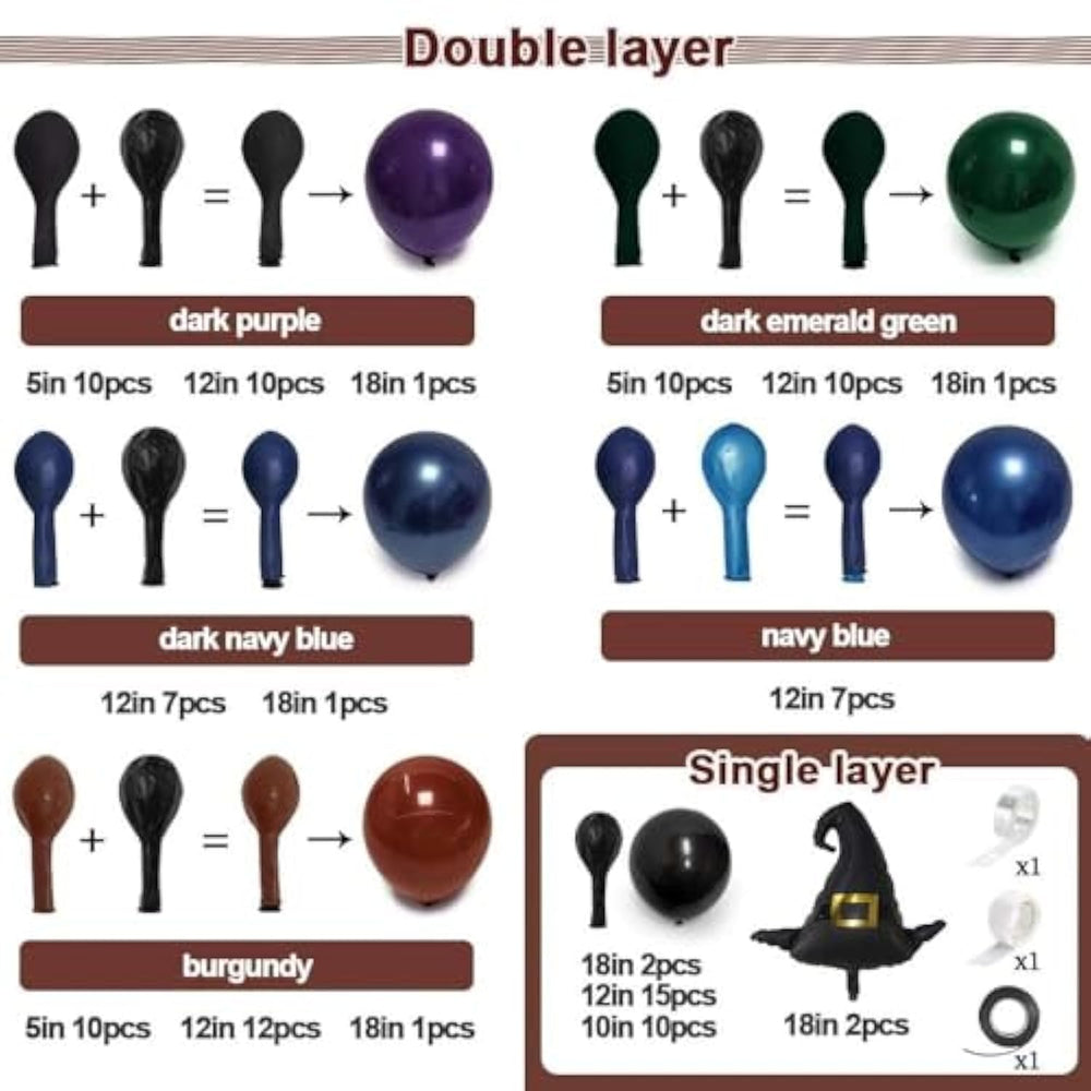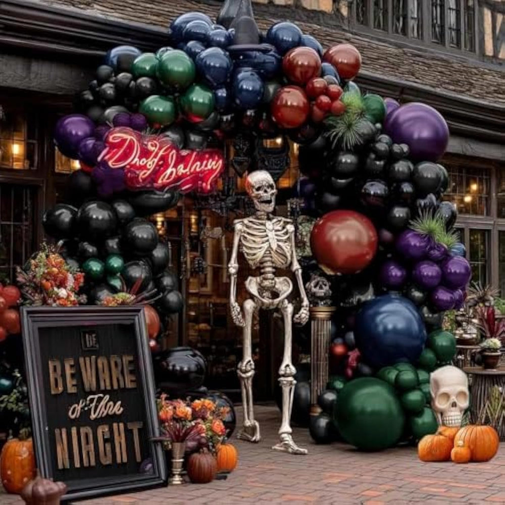 This Double Stuffed Halloween Balloon Arch features a spooky mix of navy blue, dark purple, burgundy, emerald green, and black balloons, including 5 dark accent balloons for a mysterious, witchy vibe. The kit includes a variety of sizes: double dark purple (5"×10, 12"×10, 18"×1), double navy blue (12"×7, 18"×1), double dark navy (12"×7), double emerald green (5"×10, 12"×10, 18"×1), double burgundy/maroon (5"×10, 12"×12, 18"×1), black (10"×10, 12"×15, 18"×2), plus a balloon strip, glue, and black ribbon. Made from thick, durable latex, these balloons are safe for children and can stay inflated up to 48 hours when handled properly. Easy to assemble, simply inflate, insert the double-stuffed balloons into the strip, and shape with ribbon and glue dots to hang over tables, doorways, or yards. Perfect for Halloween, gothic, witch, skeleton, or spooky-themed parties. Note: avoid overfilling and direct sun exposure; colors may slightly vary before and after inflation.