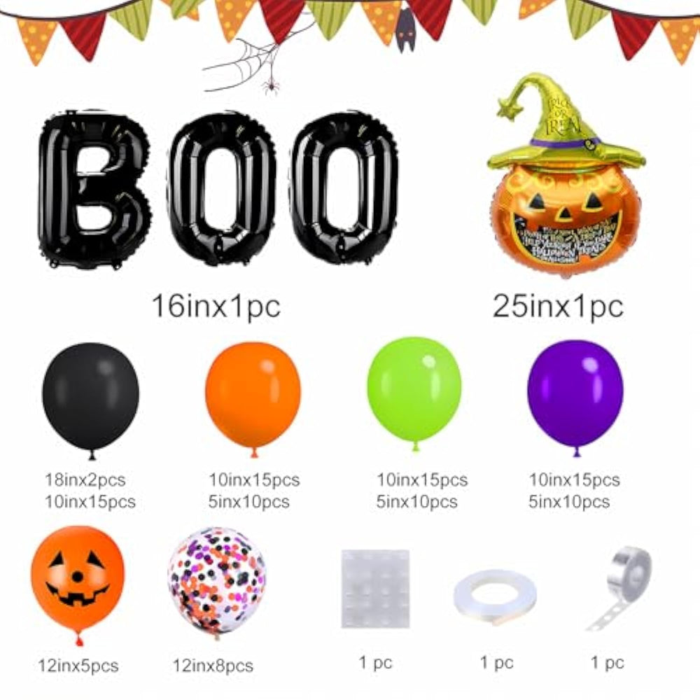 This Halloween Balloon Arch Kit includes 4 foil balloons, 105 latex balloons in 6 vibrant colors, and 3 essential accessories to help you create a stunning party setup. Crafted from premium latex and durable polyester with aluminum film, these balloons are safe, non-toxic, and built to last, though care should be taken not to inflate them more than 85% to prevent bursting. Perfect for Halloween-themed parties, birthday celebrations, trick-or-treat gatherings, ghost and pumpkin parties, or any festive occasion, this balloon kit adds a spooky yet colorful touch to your decorations. Easy to assemble, simply insert the inflated balloons into the arch chain and use the included tie tool for quick setup, making it a fun and creative family activity that transforms your party into a magical Halloween experience.