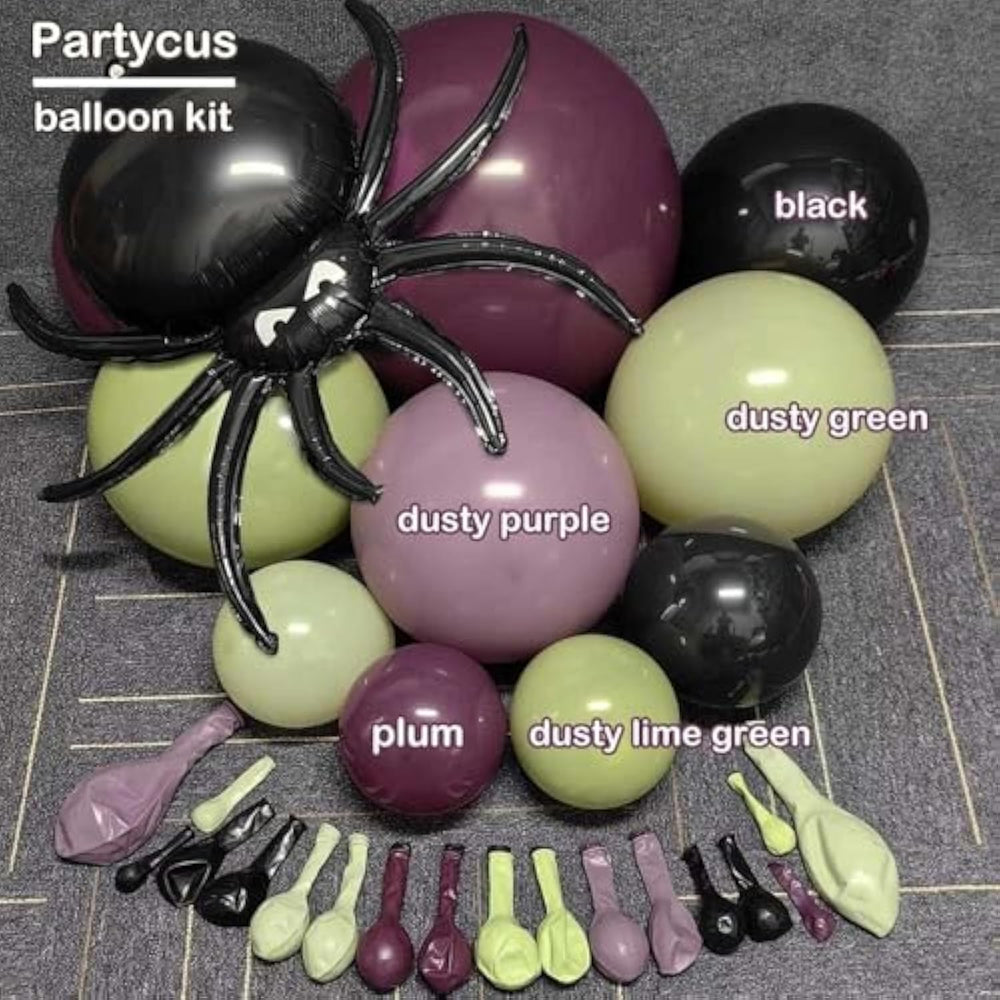 This dusty purple and green Halloween balloon garland features double-layer dusty lavender, dusty green, plum, and black balloons, accented with black spider foil balloons for a spooky, fun look. The kit includes assorted sizes of double and single-layer balloons, two black spider foil balloons, a balloon strip, glue, and black ribbon, allowing for easy DIY assembly. Made from thick, high-quality latex, the balloons are safe, durable, and maintain inflation for up to 48 hours when used properly. Perfect for creating arches or garlands over tables, doorways, yards, or backdrops, this versatile set is ideal for Halloween parties, spooky birthdays, witch or haunted house themes, gothic gatherings, trick-or-treat events, and other festive celebrations.
