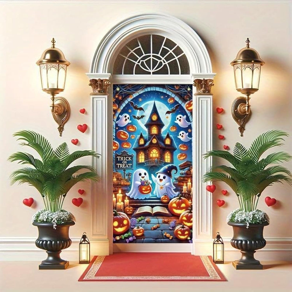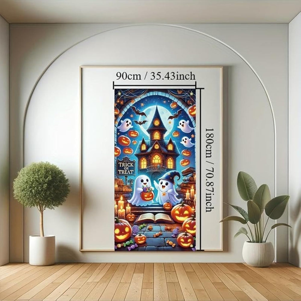 This Halloween banner showcases an adorable ghost design, with two cheerful ghosts holding pumpkin buckets, glowing jack-o’-lanterns, and a spooky haunted house backdrop. Measuring 71x35 inches, it’s a large, eye-catching decoration ideal for parties, haunted house entrances, or festive yard displays. Crafted from high-quality polyester, the banner is lightweight, weather-resistant, and durable for both indoor and outdoor use. Designed for convenience, it comes with grommets and rope for quick setup, and it’s foldable and reusable, making it a perfect choice for multiple Halloween celebrations.