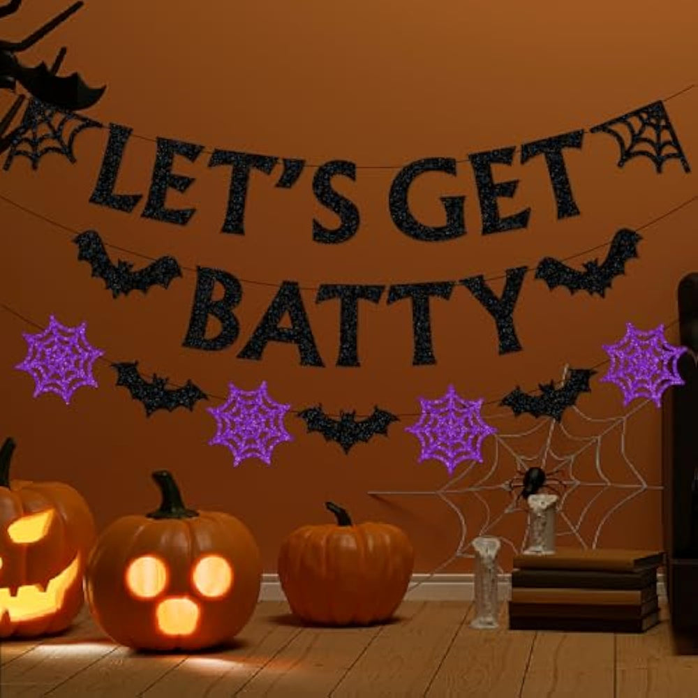 The Halloween Paper Party Decoration Kit includes 8 pieces: 1 “Let’s Get Batty” banner, 1 bats and spider web banner, and 6 spider cutouts with rope. Made from eco-friendly black and purple paper, these decorations are reusable for future Halloween or anniversary-themed parties. Each letter and piece has pre-punched holes for easy DIY assembly using the included ropes. Perfect for hanging from ceilings, above tables, doorways, windows, or arches, this set adds a spooky and festive touch to Halloween parties, birthdays, or seasonal décor.