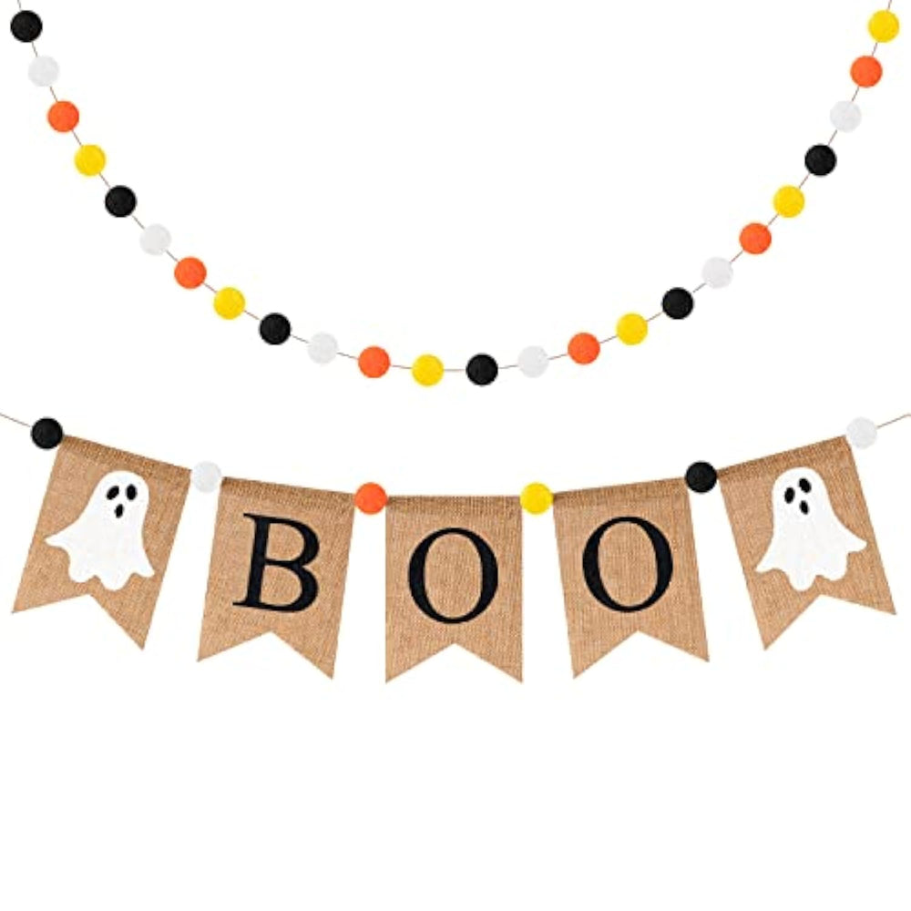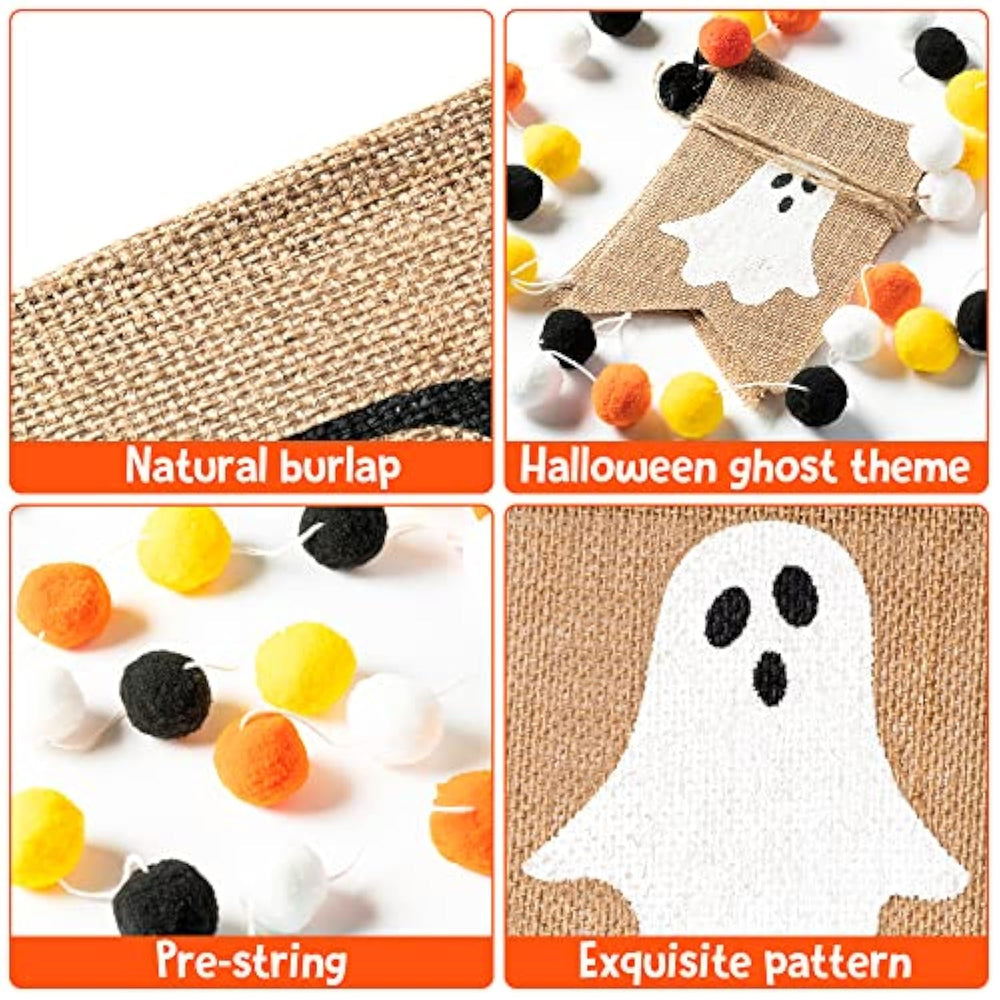 This Boo Burlap Banner set includes a pre-assembled natural burlap banner with “Boo” and ghost designs, along with a colorful felt ball string in black, white, orange, and yellow. Made from durable burlap and felt, the banner is reusable and long-lasting. Perfect for decorating windows, walls, bedrooms, or fireplaces, it adds a festive and playful touch to any Halloween party and makes a charming gift for friends or children.