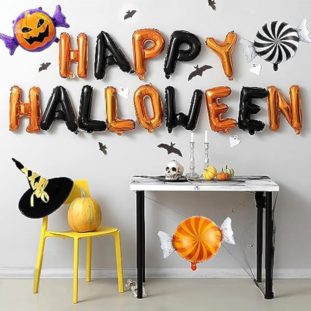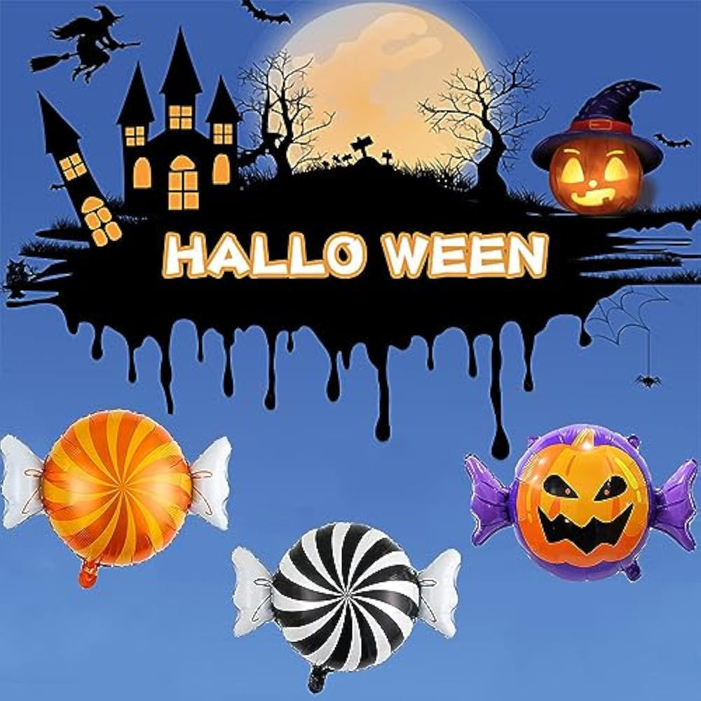 These Halloween candy balloons are made of durable aluminum foil, reusable, and not easy to break. Designed with bright pumpkin and candy prints in orange, black, and festive patterns, they make eye-catching decorations for Halloween parties. The set includes 9 balloons in 3 different styles, 3 pieces of each. Easy to use, they automatically seal after inflation and can be floated to the ceiling or attached to walls, doors, tables, or windows. Perfect for adding a playful touch to Halloween celebrations, these balloons are convenient to inflate and deflate, with 80β90% inflation recommended to prevent bursting.