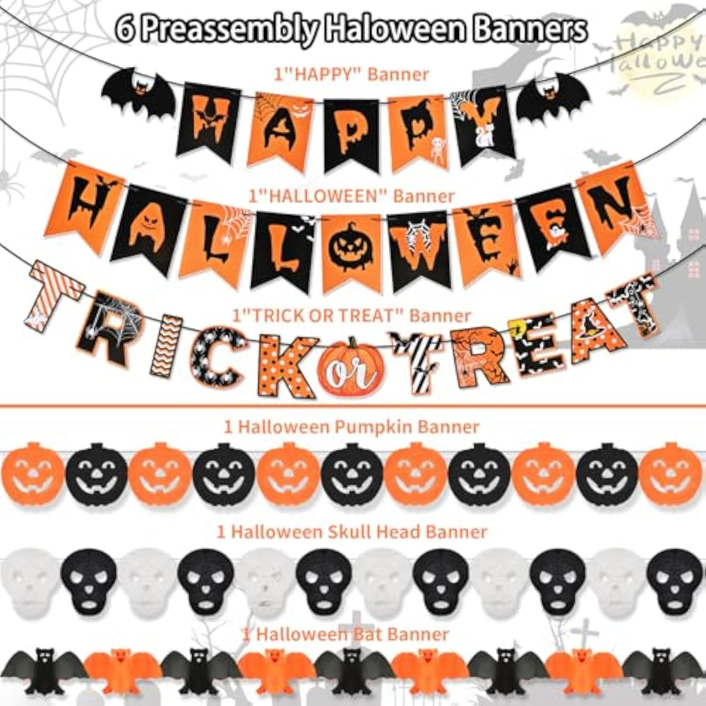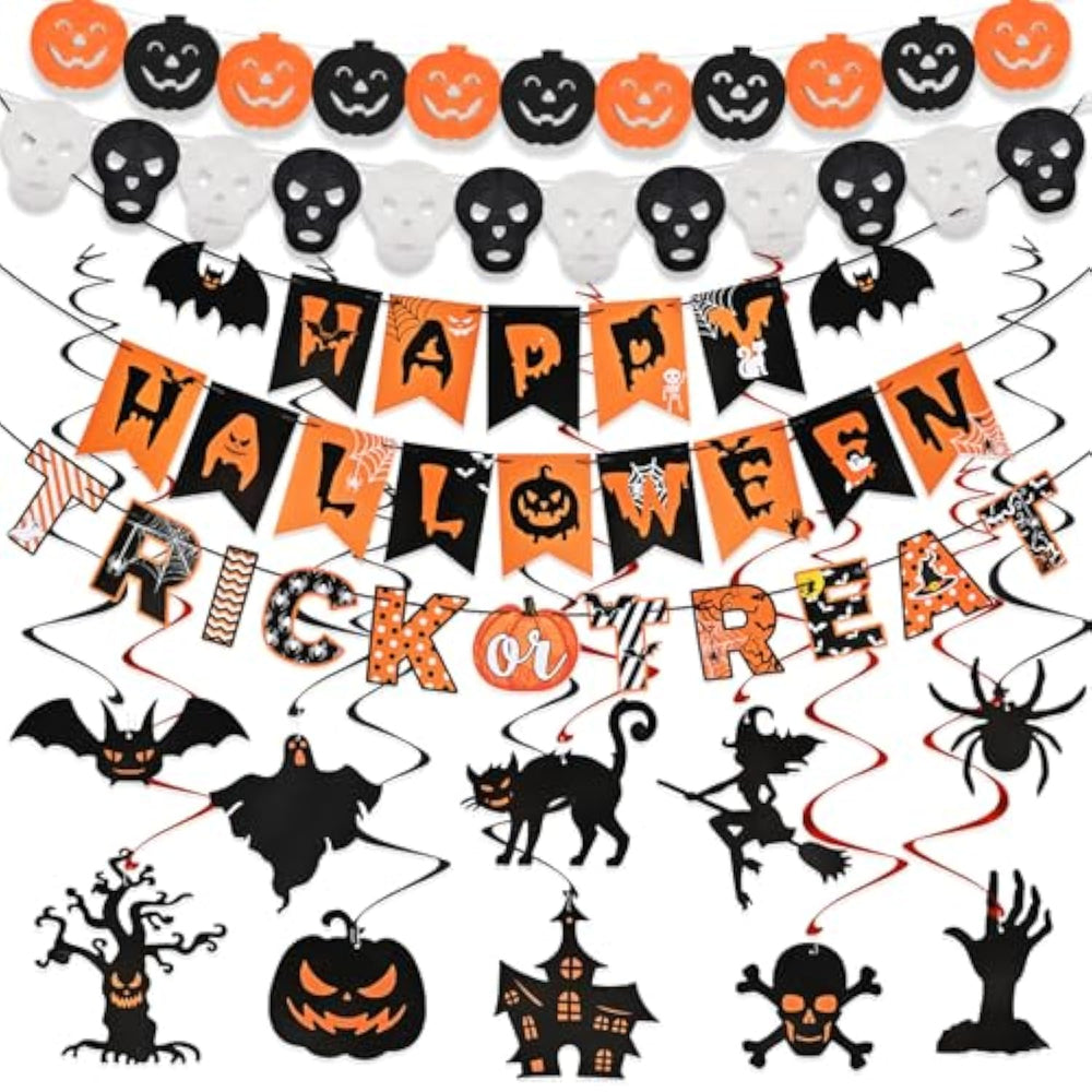 This Halloween decoration kit includes 10 hanging swirls and 6 pre-assembled banners featuring “HAPPY,” “HALLOWEEN,” “TRICK OR TREAT,” pumpkins, skulls, and bats. Made from thick, high-quality cardstock with bright printing, these decorations are durable, vibrant, and reusable. Easy to set up by linking the cardboards to the swirls and unfolding the paper patterns, they can be hung on walls, shelves, doors, balconies, or party spaces. Perfect for Halloween parties, trick-or-treat events, birthdays, school activities, or office décor, they also double as fun photo props to create a festive and memorable atmosphere.