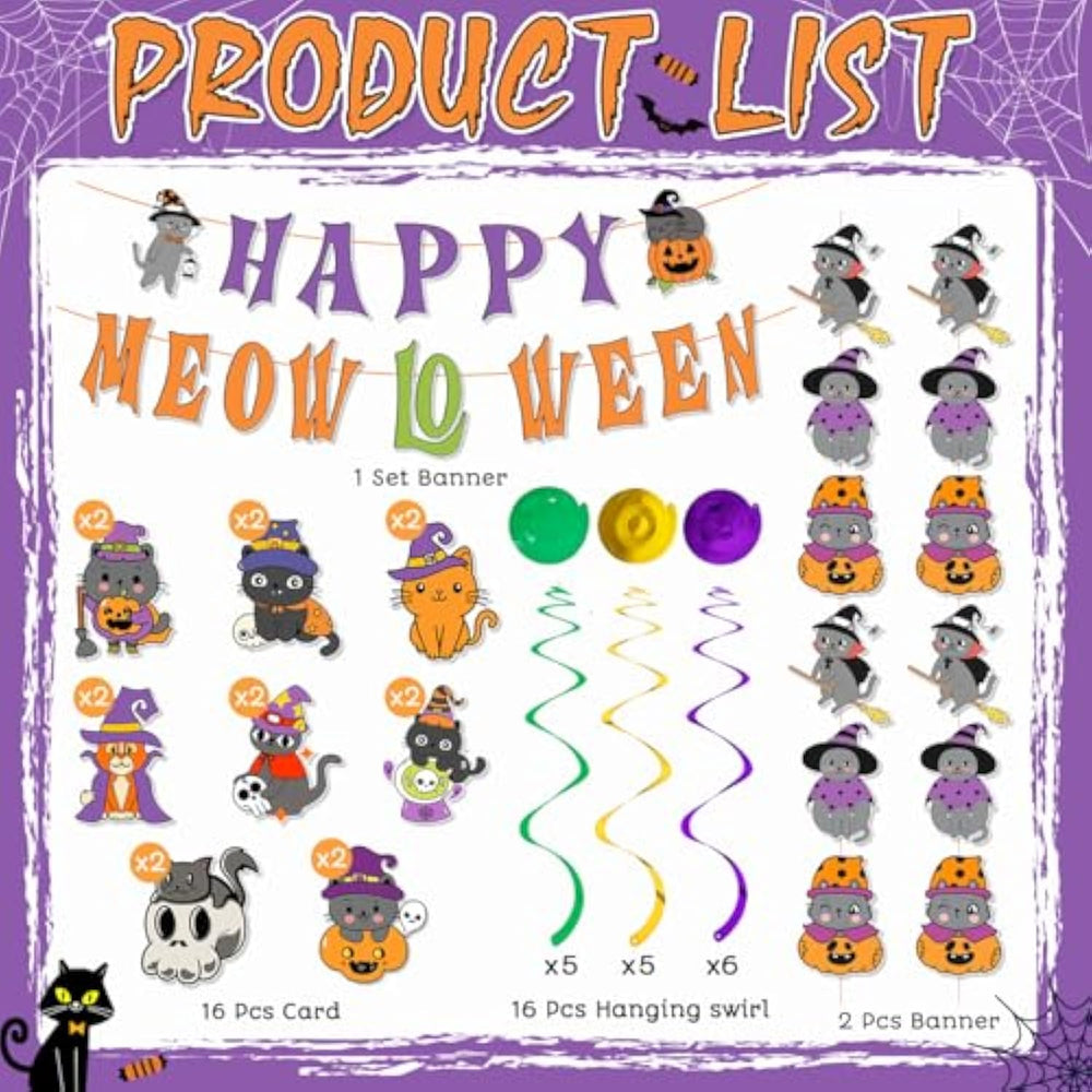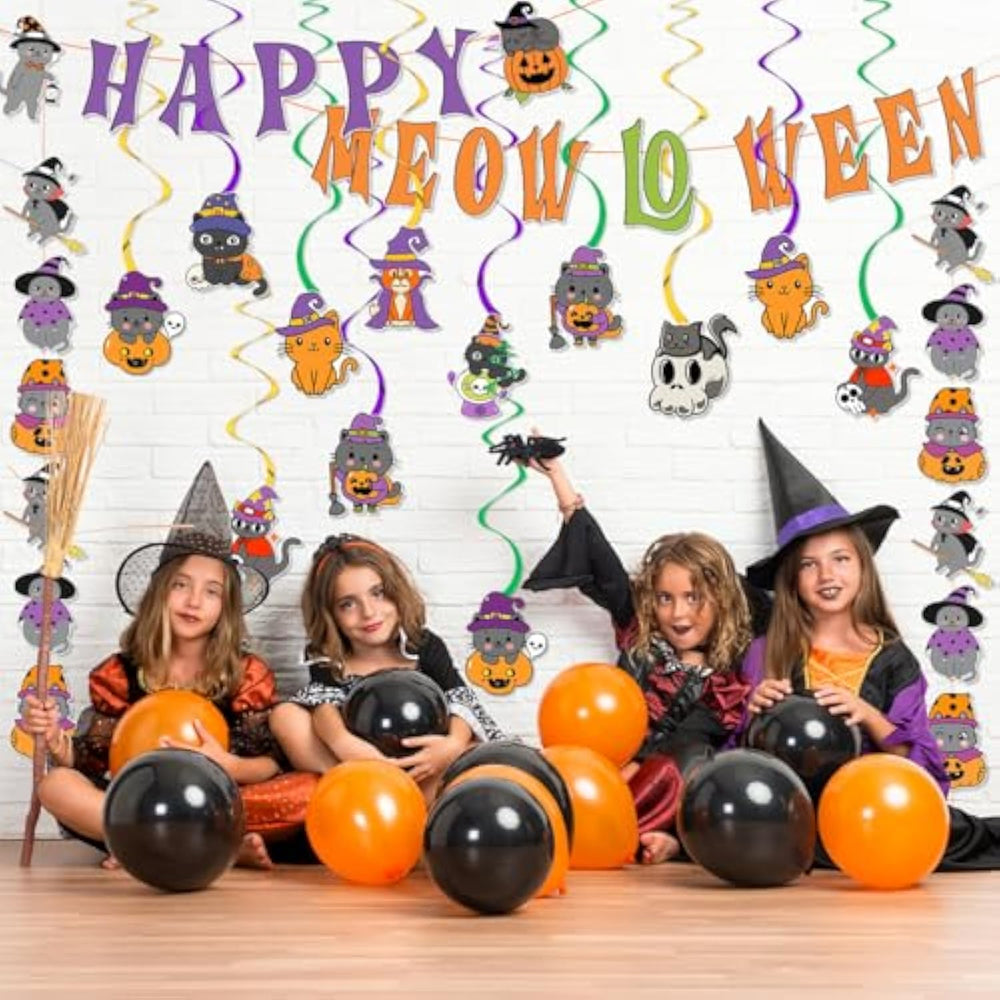 The Happy Meow-Loween Halloween Party Decorations Set features a charming combination of cute and spooky elements, including 2 “Happy Meow-Loween” banners, 16 cat-themed hanging swirls, and 2 small cat Halloween hanging banners. Made from high-quality, digitally printed cardboard, these decorations are lightweight, sturdy, and long-lasting, making them perfect for indoor spaces, doorways, walls, or windows. The designs highlight ghost-like kittens alongside classic Halloween patterns such as pumpkins, skulls, and ghosts, creating a playful yet festive atmosphere. Easy to assemble, the banners can be connected as desired, and the hanging swirls tear along perforations into spiral shapes, ready to hang and instantly transform any Halloween birthday party, baby shower, or cute-themed Halloween celebration.