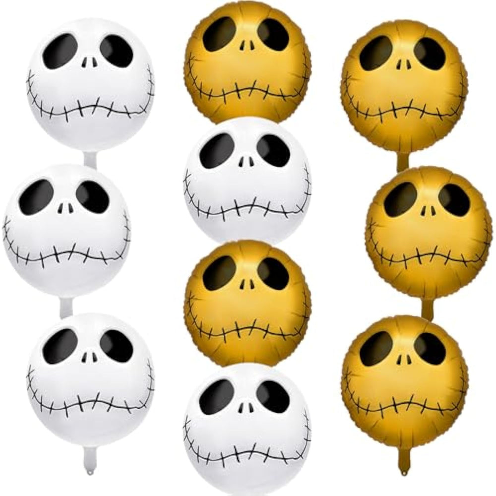 This Halloween birthday party decoration set includes 10 foil balloons—5 gold skeleton face balloons and 5 white skeleton balloons, each measuring 18 inches—along with a roll of ribbon and a straw for easy inflation. Made from high-quality, durable, and eco-friendly foil material, these balloons are lightweight, reusable, self-sealing, and resistant to cracking or fading. Featuring spooky skull designs, they are perfect as photo backdrops or props to enhance the festive atmosphere. Simply inflate with a straw or air pump, and the self-sealing valve ensures no air leakage, making them a convenient and fun choice for any Halloween celebration.