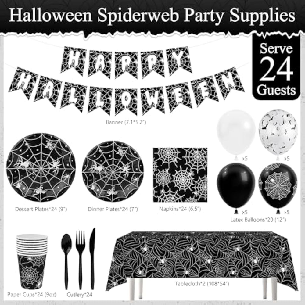 Turn your celebration into a chillingly stylish event with our Spooky Spiderweb Halloween Theme Tableware Set, a complete kit designed to impress guests and make hosting effortless. Featuring eerie black spider and spiderweb patterns across plates, cups, napkins, and a waterproof tablecloth, plus bold “HAPPY HALLOWEEN” and “HAPPY BIRTHDAY” banners with matching balloons, this set creates the ultimate festive backdrop for any spooky gathering. The kit includes 24 large 9-inch plates, 24 small 7-inch plates, 24 9oz cups, 24 napkins, and 24 sets of forks, spoons, and knives, ensuring you can serve up to 24 guests with ease. Crafted from premium-quality, food-safe materials, the sturdy dinnerware holds all kinds of party treats, while the thick tablecloth resists spills and protects your surfaces. Perfect for Halloween parties, haunted house events, trick-or-treat gatherings, birthdays, and even Halloween baby showers, this all-in-one set offers both style and convenience. Best of all, the disposable yet durable design makes cleanup quick and stress-free, leaving you more time to enjoy the spooky fun with friends and family.