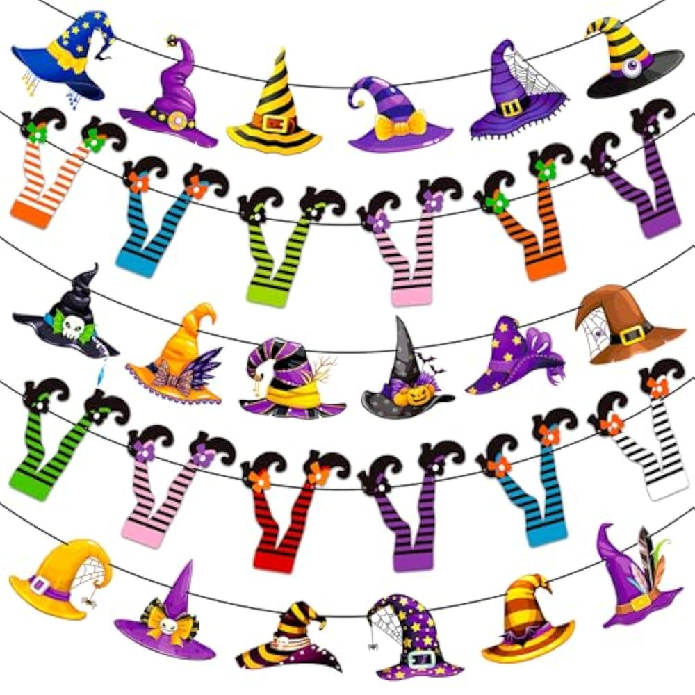Complete Halloween Witch Banner Set – This festive set includes 3 witch hat banners and 2 witch boot banners, perfect for creating a coordinated Halloween display. Featuring colorful hats in purple, orange, and black with star details, along with striped witch boots, each piece adds a whimsical, seasonal touch. Ideal for Halloween parties, witch-themed birthdays, baby showers, or seasonal décor, the banners are easy to hang, making an eye-catching backdrop or wall decoration.