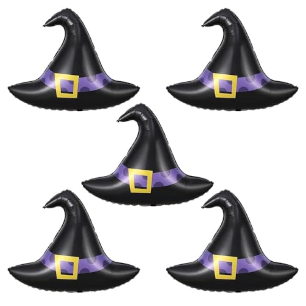 This Halloween Witch Hat Balloon set includes 5 foil balloons, each measuring 28 × 21.65 inches, along with a straw for easy inflation. Made from thick, durable foil, these balloons are reusable and can last at least a week once inflated. Simply use air for standard decoration or helium to make them float. Perfect for Halloween parties, witch-themed events, trick-or-treat setups, haunted house decorations, or any spooky celebration.