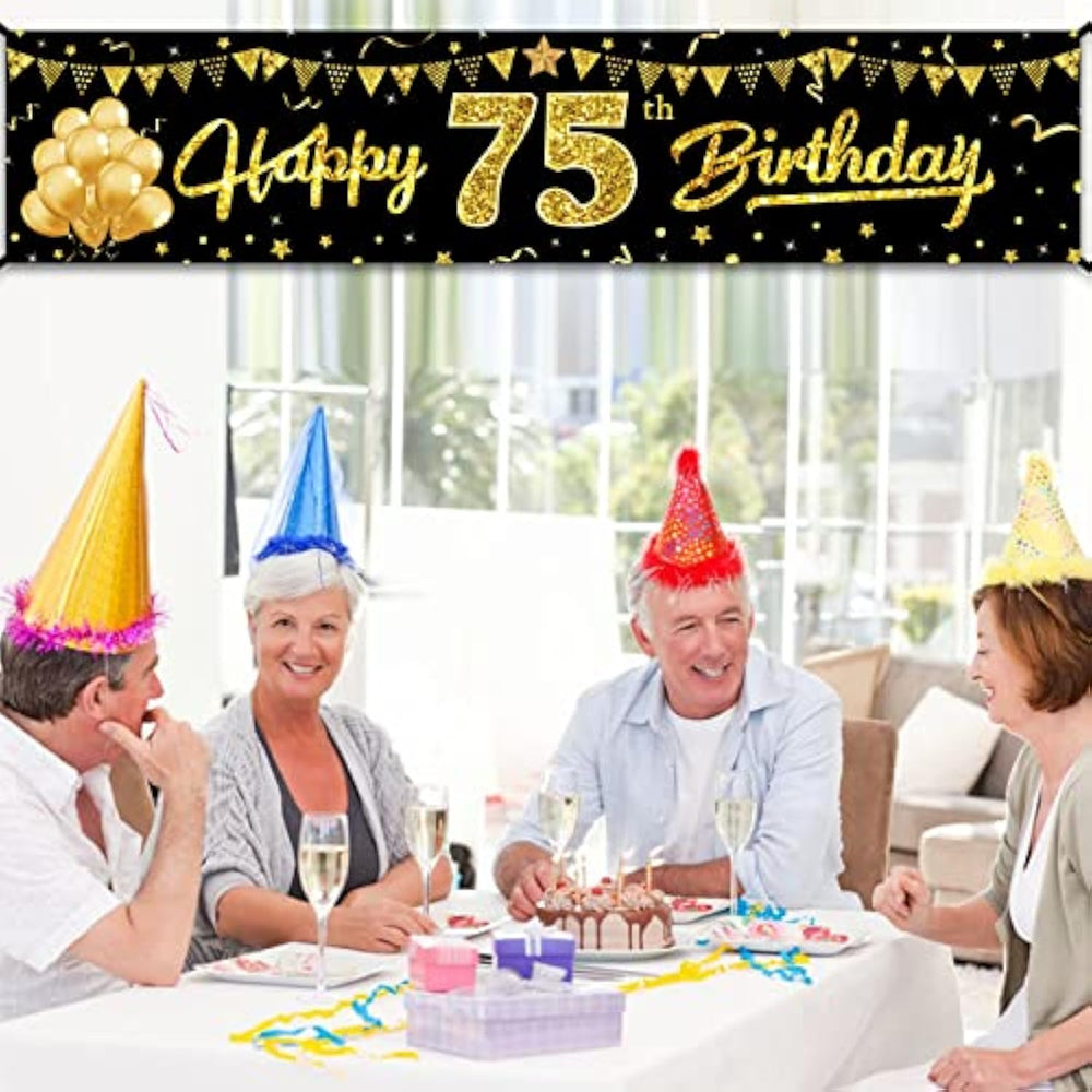 | [You Will Get]-1Pcs Black Gold "Happy 75Th Birthday" Banner Party Decoration. The Size Is 72.8 X 15.7 Inches. This Banner Sign Can Well Highlight Your 75Th Birthday Theme And Create A Strong Party Atmosphere. [Note: Poles Or Stakes Are Not Included In The Package] | | [75Th Birthday Theme]-Using Classic Black Gold Color With Exquisite Big Balloons, Stars, Ribbons, Pennants, Dots And Other Rich Party Elements. The Number "75" Composed Of Shiny Sequins Is Very Eye-Catching, It Will Add Highlights For Your 75Th Birthday Party. | | [Applicable For]-Very Suitable For 75Th Birthday Party Activities. It Can Be Used Indoor And Outdoor. It Can Be Hung On The Front Door, Porch, Wall, Window, Ceiling, Fence, Tree Branch, Etc., And It Can Also Be Used As The Background Of The Photo. | | [Well Material]-Made Of Thick Polyester Fabric. It Is Light Weight, Easy To Carry, Washable, Foldable, Tear-Resistant, And Reusable. | | [Easy To Use]-There Are Copper Holes On The Four Corners Of The Banner. You Only Need To Use The Attached Rope Through The Copper Hole To Easily Hang It Up To Decorate Your Party. | |