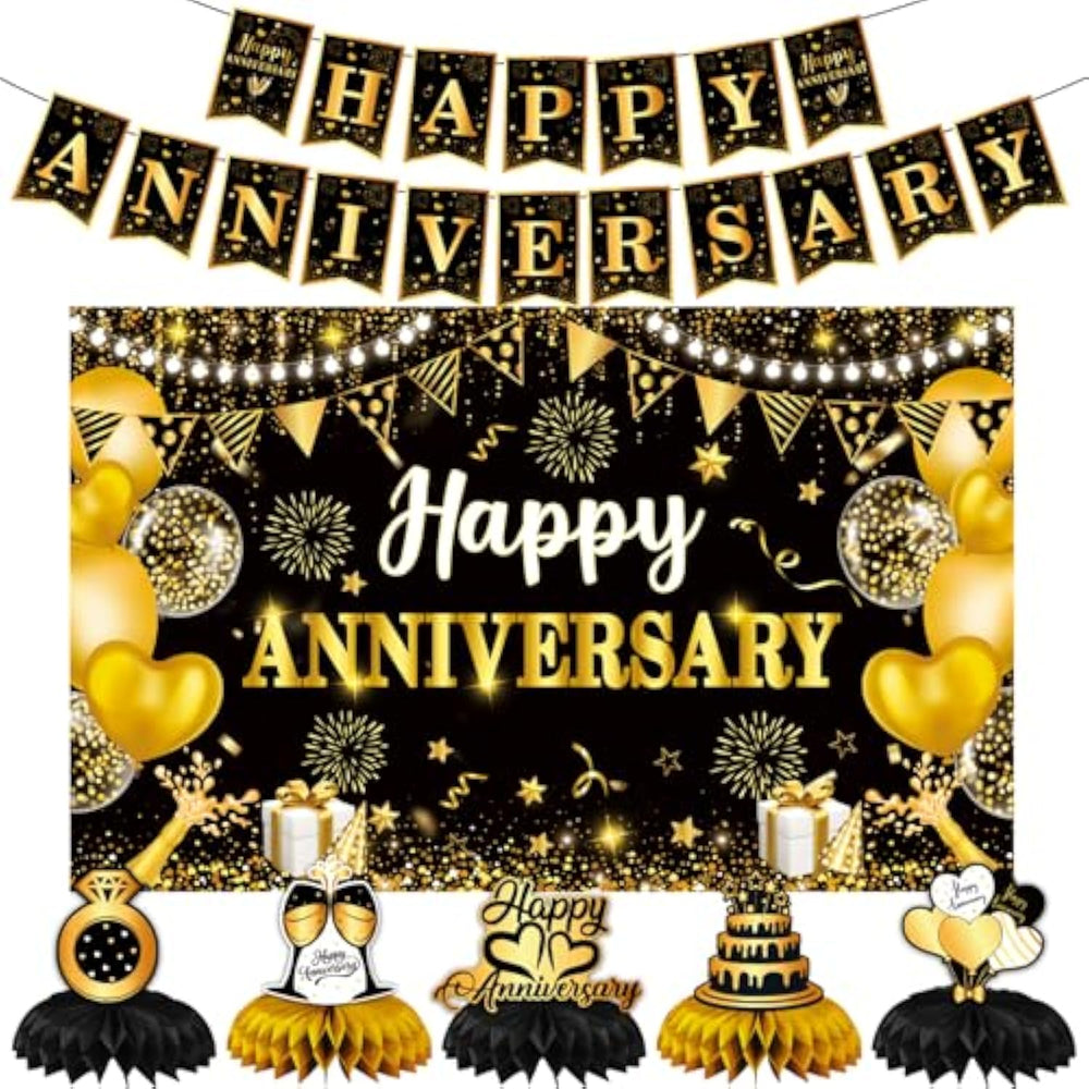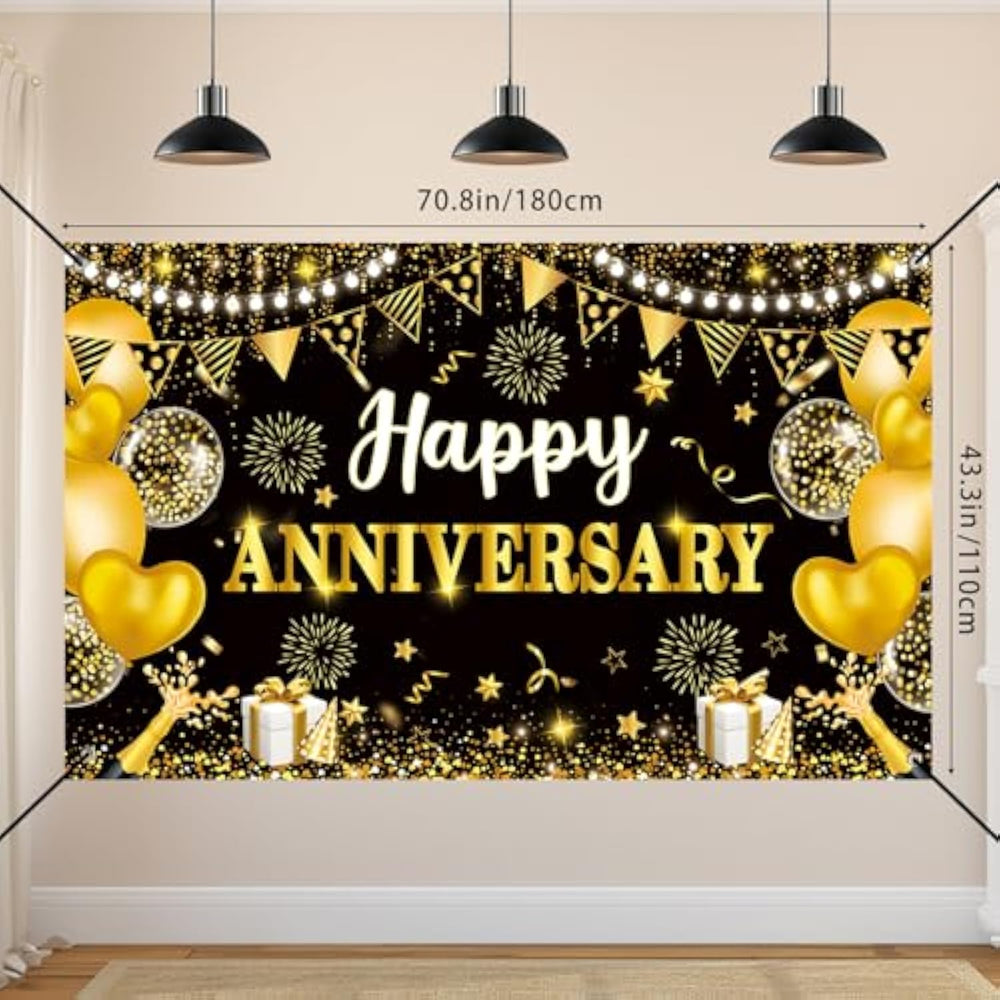 | ?50Th Anniversary Decorations?You Will Get 1Pc Black Gold Happy Anniversary Banner, 1Pc Happy Anniversary Backdrop(1.1M X 1.8M/43.3In X 70.8In), 6Pcs Happy Anniversary Honeycomb Centerpiece.These Items Are Designed To Meet All Your Decoration Needs, Enhance The Ambiance Of Your Anniversary Celebration, And Create A Memorable And Festive Atmosphere. | | ?Black Gold Anniversary Decorations?The Decorations Feature A Stunning Black And Gold Theme, With Glittering Gold Accents, Love Hearts, Balloons, And Other Anniversary Elements.The Gold, Black, And Sequin Balloons Are Elegantly Printed With The Words "Happy Anniversary," Adding A Touch Of Sophistication And Shine To Your Party. | | ?Durable High-Quality Materials?The Anniversary Backdrop Is Made From Durable, Tear-Resistant Fabric, Ensuring Long-Lasting Use.The Black And Gold Anniversary Banners And Centerpieces Are Crafted From High-Quality, Lightweight Paper, Making Them Portable And Reusable.The Centerpieces Are Double-Sided, Offering A Versatile And Eye-Catching Display. | | ?Easy To Use?The Black And Gold Anniversary Yard Signs Come With Ropes For Easy Hanging.You Can Effortlessly Set Them Up On Tables, Chairs, Walls, Floors, Or Any Other Desired Location.Your Family And Friends Will Be Impressed By The Beautiful Decor, Leaving A Lasting Impression. | | ?Anniversary Decorations For Party?These Black And Gold Wedding Anniversary Decorations Are Perfect For A Variety Of Occasions, Including Wedding Anniversaries, Birthday Parties, And Friendship Celebrations.They Can Be Used To Decorate Walls, Windows, Dessert Tables, Yards, Trees, Cars, And Both Indoor And Outdoor Spaces.Additionally, They Make An Excellent Photo Backdrop, Adding A Touch Of Elegance To Your Event Photos. | |