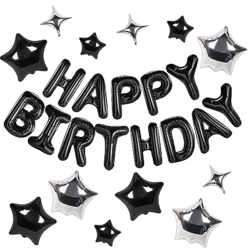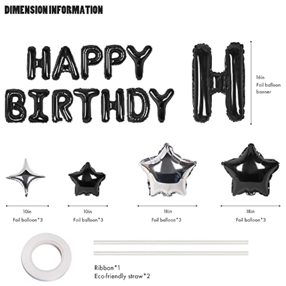 Aluminum | ??Valuable Pack : Each Package Come With ?Black Happy Birthday Letters X13Pcs(16In) ? Black Four-Pointed Star X3Pcs (10In)? Black Five-Pointed Star X3Pcs (10In) ? Black Five-Pointed Star X3Pcs+Silver Five-Pointed Star X3Pcs (18In) ?Plastic Straw X2Pcs ?Ribbon X1Pcs. | ??High Quality : Our Premium Quality Banners Are Crafted With A Durable, Ultra-Shiny Aluminum Foil That Maintains Form Without Leaking Or Losing Air.It Can Be Used Every Year With Proper Care And Maintenance. Simply Store Them Away For Future Use. | ??Birthday Party Decoration : The Happy Birthday Balloons Are Fast And Easy To Inflate Using The Straw.Tape It Or Use The Ribbon To Hang The Happy Birthday Sign On The Wall, Window, Curtains, Ceiling, Backyard Or Anywhere Else. The Bright, Vibrant Color Making Your Party Stand Out. Have Fun Party Time And Make Some Unforgettable Fond Memories. | ??Suitable For Any Age : This Cute Happy Birhday Banner Set Is Perfect For Girls,Boys,Kids,Women,Men'S Birthday Party. | ??100% Satisfaction : Providing Our