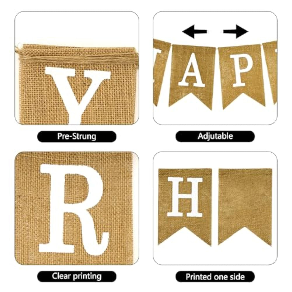 | ?Happy Birthday Banner Decoration?You Will Get 2 Packs Birthday Garland, 8 Ft "Happy" Banner + 9Ft "Birthday" Banner. And Each Burlap Flag Is 5"X 7"/13 X 18 Cm, Great Length And Size For Fireplace, Tables, Doorways, Porches, Deck Railings Or Outdoor Birthday Party Decoration - Anywhere. | | ?Burlap Happy Birthday Banners?Our Happy Birthday Banner Garland Is Made Of Thick Hessian Burlap And Stays Put And In Shape. Well Made And Reusable. And Neutral Color That Can Match Nicely With Pretty Much Any Birthday Theme, Or It Looks Great On Its Own. | | ?Pre-Strung And Adjustable?This Burlap Birthday Garland Banner Is Assembled So Arrives Ready To Hang On The Wall And Won'T Take Up Any Time. Easy To Unfold And Hang. You Can Change The Spacing On The Burlap Flag, Making Them Close Or Farther Apart. | | ?Resuable Happy Birthday Banner?Our Birthday Burlap Banner Is Printed White Happy Birthday, The White Letters Are Large And Easy To Read And Maintain The Look And Feel Of Arts And Crafts. In Addition, Rustic Style Means It Can Be For Any Age And Brighten Up A Celebration! | | ?Birthday Banners Of All Ages?Our Rustic Happy Birthday Banners Add Brilliance To Birthday Decorations, Creating A Special Event For Your Birthday Party. Suitable For Birthday Parties Of Different Ages, Such As 3Rd Birthdays For Kids, 21St Birthday For Girls, 30Th Birthday For Men, 80Th Birthday For Grandparents, Etc. | |