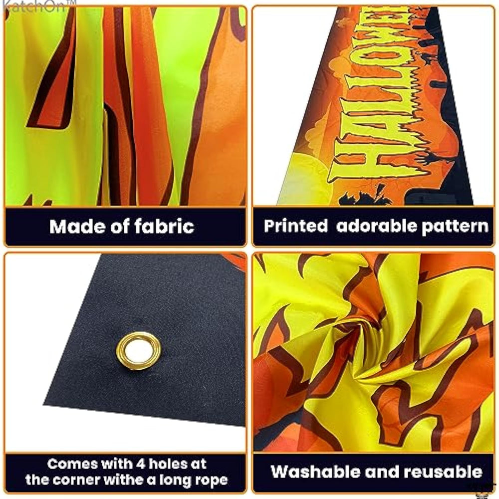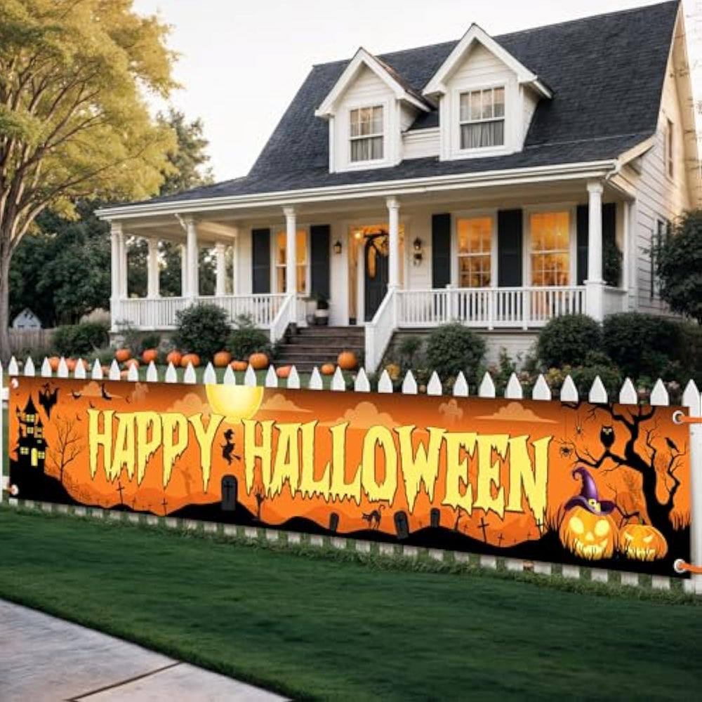 This extra-large Happy Halloween yard banner measures 120x20 inches and features a bold orange and black design with classic spooky elements like bats, haunted houses, and pumpkins, making it a striking decoration for outdoor Halloween celebrations. Made from durable, weather-resistant cloth fabric, the banner is smooth, sturdy, and tear-resistant, ensuring it withstands outdoor conditions and can be reused year after year. Each corner includes metal rings with an attached ribbon, making assembly quick and easy—just hang it on a fence, wall, or yard space in minutes. Perfect for kids’ parties, yard displays, or outdoor backdrops, this Halloween banner instantly transforms any space into a festive and eerie setting for a memorable celebration.