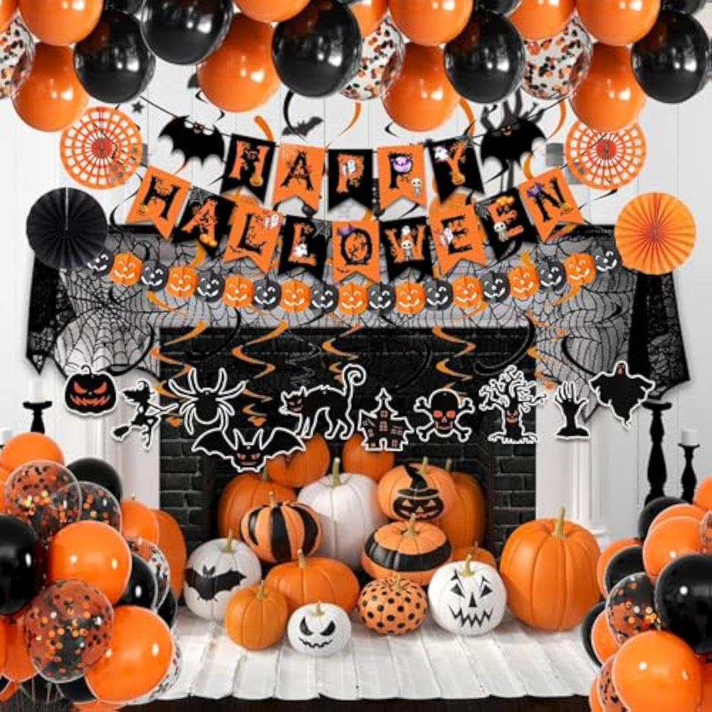 This Halloween decoration set includes paper fans, PVC swirl streamers, pumpkin lantern and Halloween banners, and a mix of latex balloons, offering everything needed to create a festive atmosphere. Made from eco-friendly materials, the pieces are reusable, lightweight, and easy to hang on walls, ceilings, or doorways. With classic Halloween colors of orange and black and designs featuring pumpkins, ghosts, bats, cats, and more, this set is perfect for parties, photo backdrops, and seasonal décor, adding a fun and spooky vibe to any celebration.