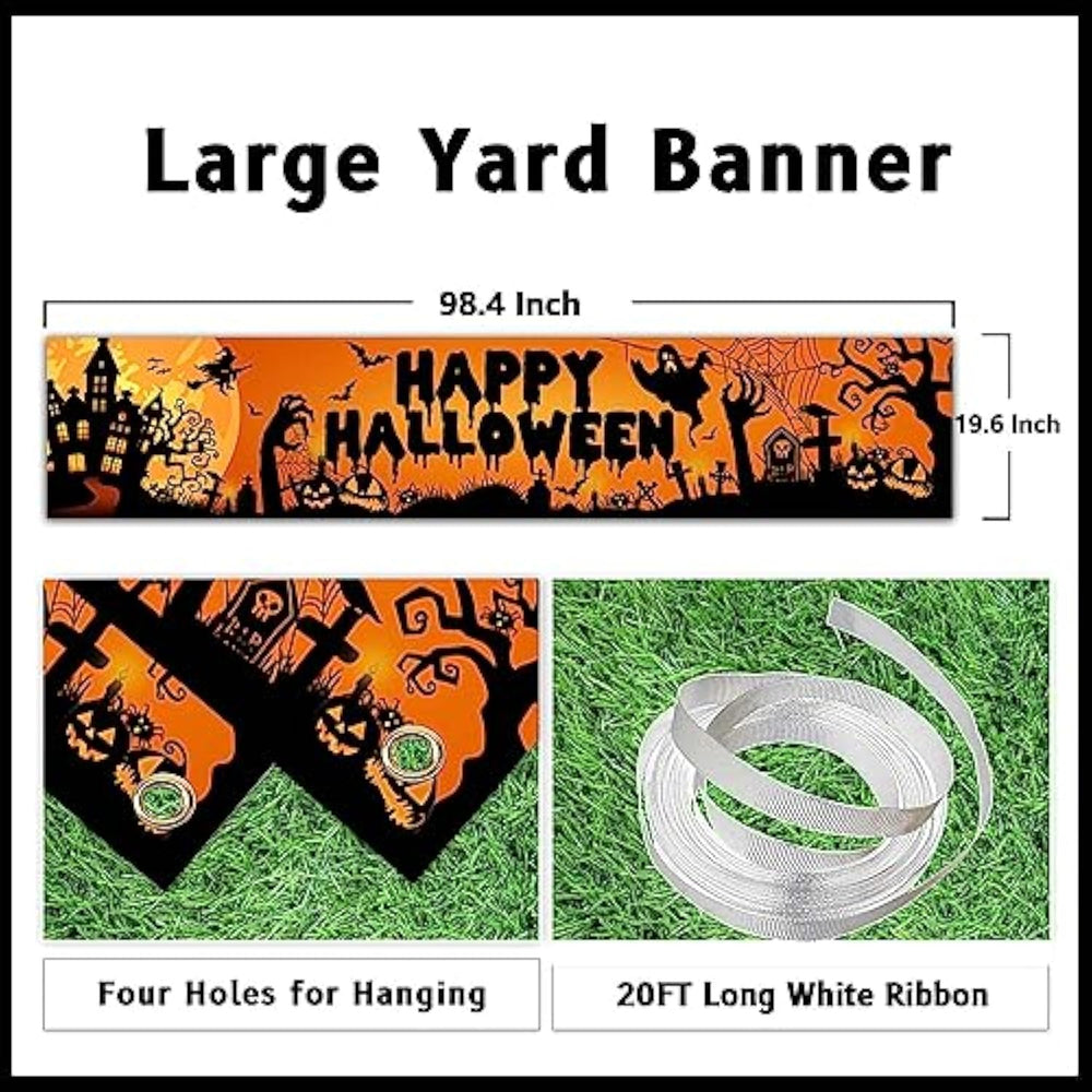 This large 98.4 × 19.6-inch “Happy Halloween” yard sign banner comes with a rope, making it perfect for both indoor and outdoor Halloween decorations. Made from high-quality, sturdy fabric, the banner features vivid, fade-resistant patterns and clear printing for a striking visual impact. Ideal for a variety of uses, it can serve as a Halloween party decoration, a welcome garden or yard sign, a fence or porch display, or even a backdrop for indoor and outdoor photo booths. To prevent creases during shipping, the banner is folded, but any folds can be easily removed by ironing the back with a steam iron, ensuring a smooth and festive display.