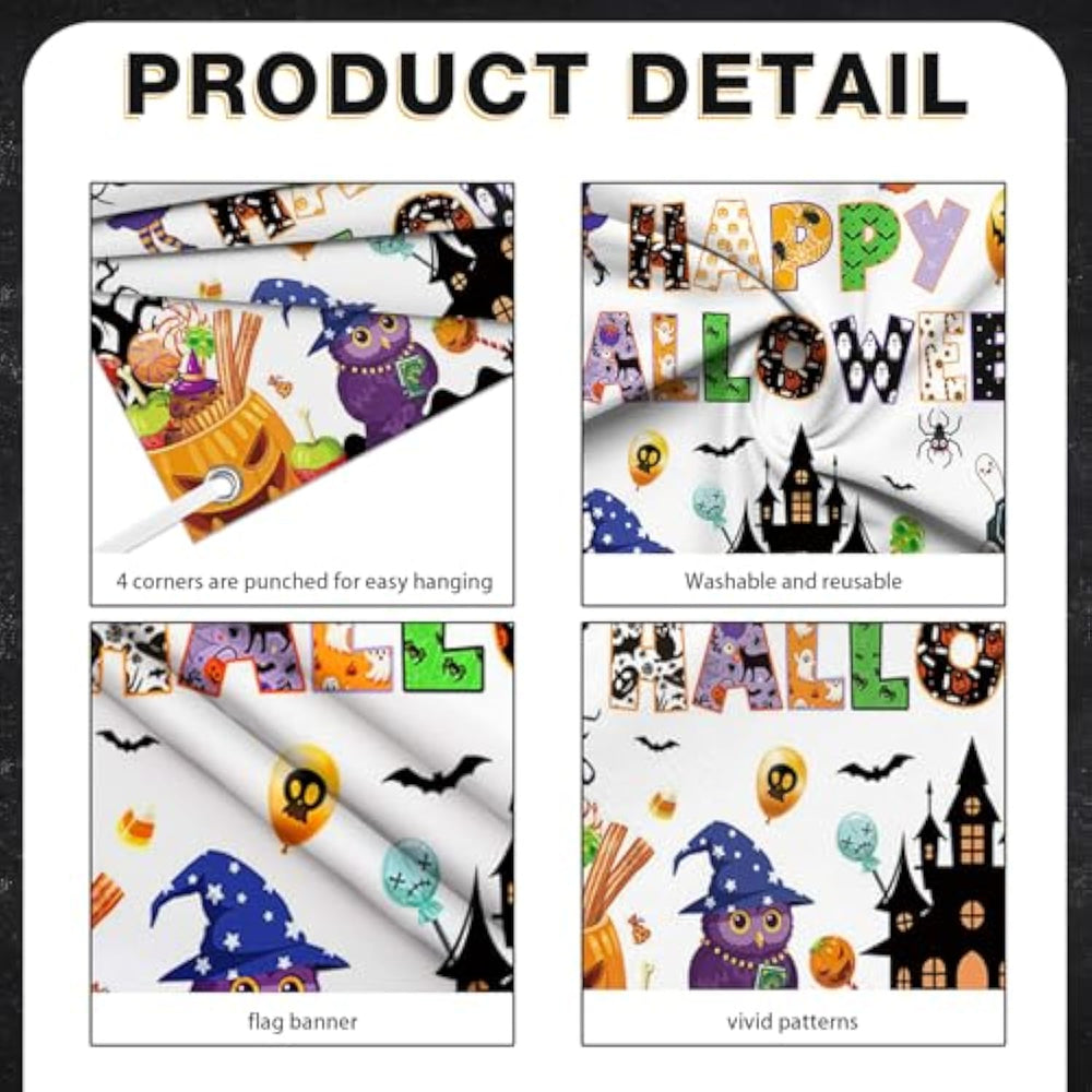 This Halloween backdrop banner measures approximately 180×110 cm and comes with a long rope for versatile hanging. Made of durable, tear-resistant polyester with vibrant, fade-resistant colors, it features a Ghost, Boo, Spider, Bat, Castle, and Pumpkin design perfect for Halloween parties. Easy to hang with corner grommets, it can be used as a photo booth backdrop, wall decoration, cake table banner, or for photography and video shoots, and is reusable for future celebrations.