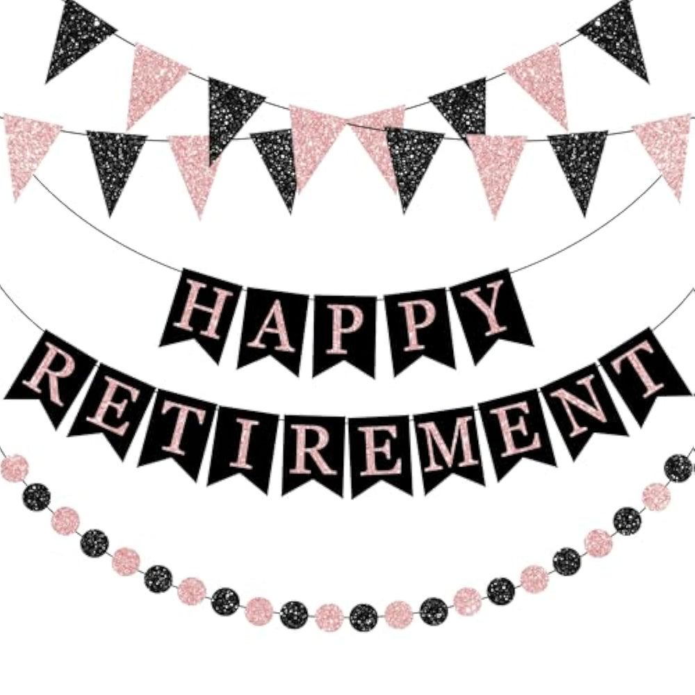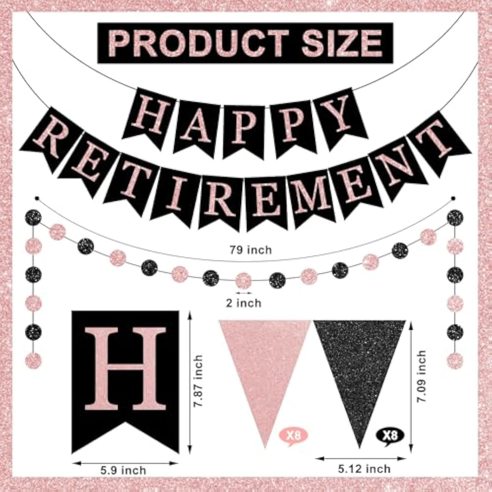 | Package Includes: You Will Receive 5 Packs Of Happy Retirement Banner Set, Including 1 Piece Of Happy Banner, 1 Piece Of Retirement Banner, 2 Piece Of Glittery Pennant Flags And 1 Piece Of Circle Dot Garland, A Complete Set To Meet Your Party Decoration Needs. Enjoy The Happy Retirement With Your Friends And Family. | | Quality Material: The Rose Gold Retirement Banner Is Made Of Quality Cardboard, Thick And Sturdy, Lightweight And Smooth, With Bright Colors And Vivid Printing, Not Easy To Break, Fade Or Bend; And The Pennant Flags And Circle Dot Garland Are Made Of Glitter Paper, Shinny And Beautiful, Can Serve You For A Long Time. | | Delicate Design: The Retirement Party Decorations Combine The Elegance Of Rose Gold And The Mystery Of Black, And With The Glittering Design, Delicate And Eye Catching, This Unique Party Banner Set Will Create A Romantic Atmosphere And Leave A Lasting Impression On Your Family And Friends On The Day Of Your Retire. | | Pre-Strung: The Happy Retirement Paper Garland Comes Pre-Strung, So All You Have To Do Is To Hang And To Prepare For Your Party, And You Can Hang It On The Window, Door, Wall And Wherever You Want To Hang It, Saving Your Valuable Time, So You Can Enjoy More Time With Your Family And Friends. | | Wide Application: The Glitter Happy Retirement Banner Is Perfect For Retirement Party, Farewell Party, Goodbye Party, Going Away Party, Anniversary Party And More, Suitable For Hanging On Door, Window, Mantel, Table, Or As A Photo Backdrop, Add The Perfect Touch To Your Retirement Decorations. | |