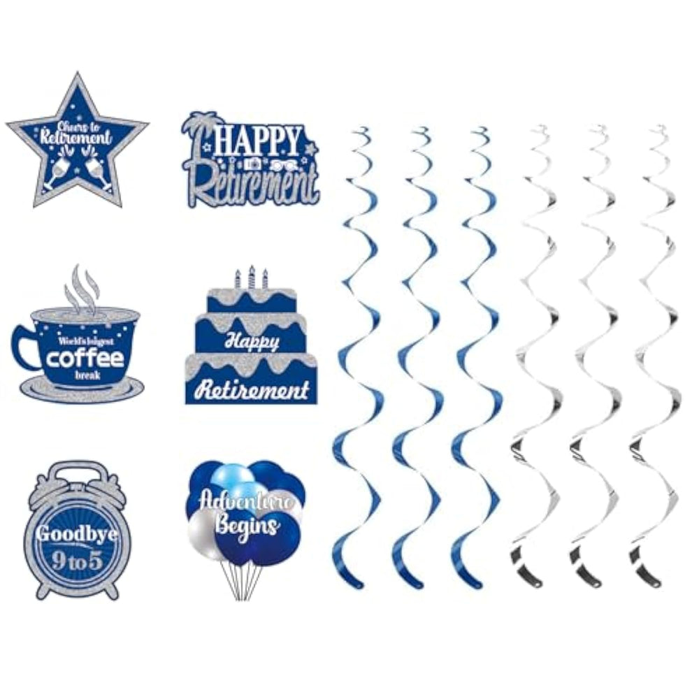| Super Value: Package Includes 6 Retirement Party-Themed Swirl String With 1 Banner Garland | | Usage Scenarios And Venues: Suitable For Hanging On A Doorway, Window, Ceiling, Outdoor Or Indoor. As A Retirement Gift, Decorating A Retirement Surprise Party | | Perfect To Highlight The Spiral Hanging Of The Retirement Party. For Dad, Mom, Wife, Husband,Anyone You Loved. | | Retirement Ideas As An Essential Central Accessory For Retirement Party. It Can Be Hung Anywhere To Create An Extra Surprise For A Retirement Party | | Easy To Use And: Decorate With Ease Using This Stylish Blue Banner Which Can Be Attached And Detached Easily. | |
