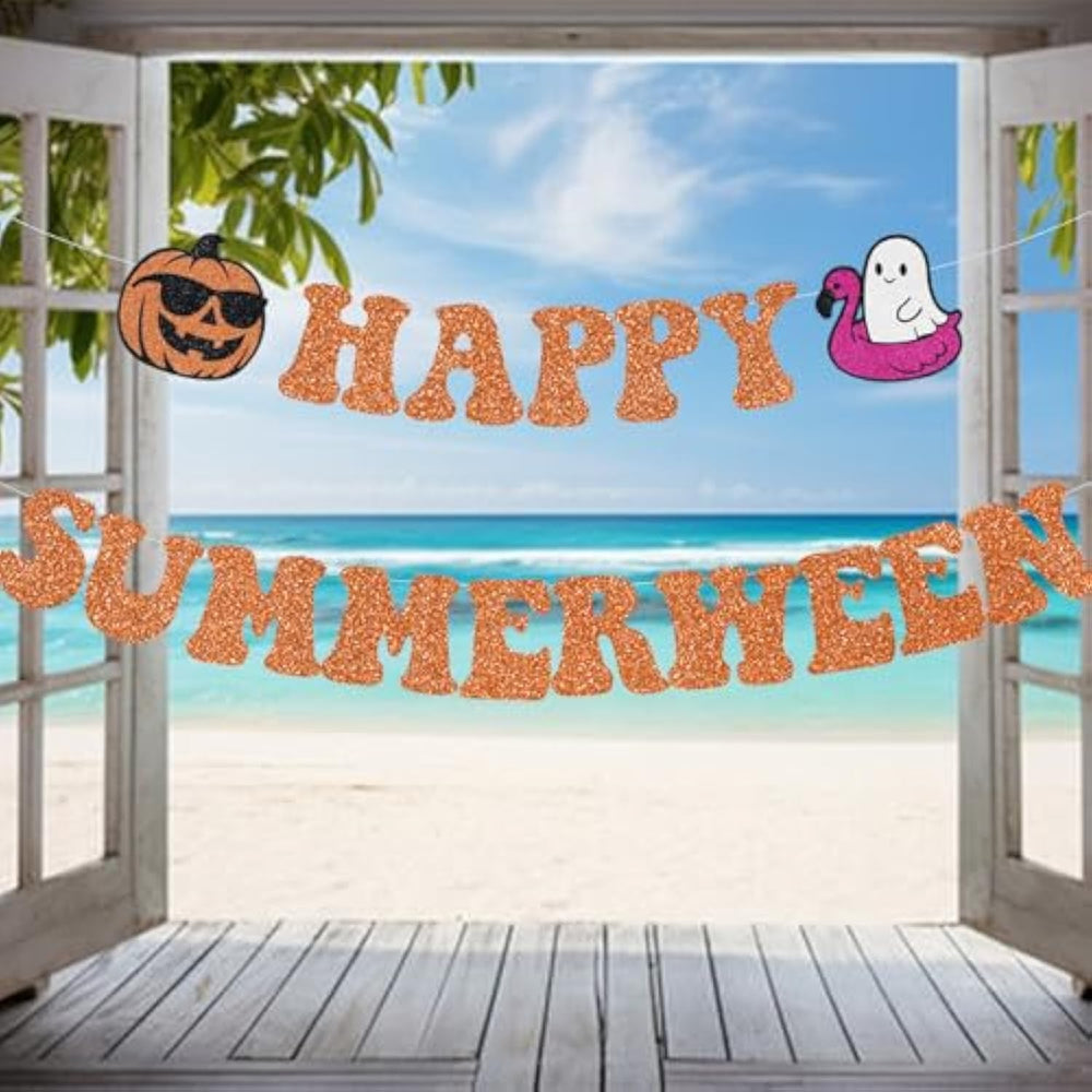 This Summerween party banner features orange glitter for a sparkling touch and includes one Halloween-in-summer themed garland. It comes with a ribbon and plastic needle for DIY assembly. Ideal for Halloween-in-summer celebrations, spooky pool parties, or festive decor, it works perfectly on dessert tables, photo booths, backdrops, or front porches. Made from glitter paper with a cute design, it adds a fun and festive vibe to any Summerween party.