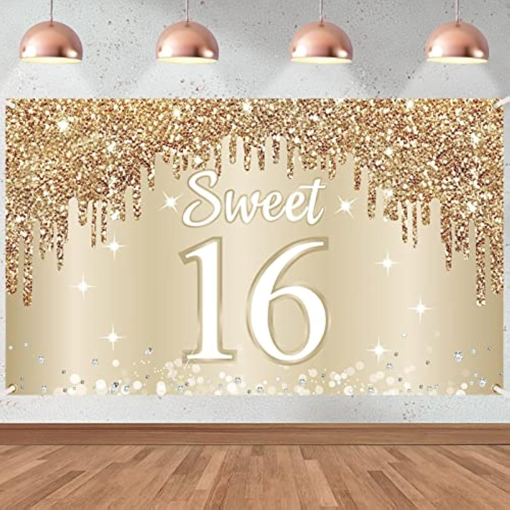 | [You Will Get] - Gold Happy Sweet 16Th Birthday Banner Backdrop Party Decorations, 72.8 X 43.3 Inches, Enough To Decorate Your 16Th Birthday Theme Party And Easily Create A Sweet And Strong Party Atmosphere. | | [Unique Design] - With The Fashionable And Classic Gold Glitter As The Theme Color, The Large Font "Sweet 16" Highlights Your Happy Sweet 16Th Birthday Theme, Adding Gold Sequins And Sparkling Diamond Elements, Which Will Add Unique Luster To Your Party And Create An Impressive Party For You. It Is Not Really Sparkling, Just The Effect Of The Poster Background. | | [Widely Used] - Very Suitable For Decorating Sweet 16Th Birthday Theme Party. It Can Be Hung On Doors, Ceilings, Walls, Windows, Courtyards, Balconies, Fireplaces And Other Indoor Or Outdoor Places. It Is Also A Great Photography Background And Photography Props. | | [High Quality Material] - Made Of High Quality Polyester Fabric, Lightweight And Durable, Clear Printing, Not Easy To Tear, Foldable And Reusable. | | [Easy To Install] - Our Banner Backdrop Has Copper Holes In The Four Corners, And Is Equipped With Ropes. You Just Need To Use The Ropes To Pass Through The Copper Holes To Hang The Banner Anywhere You Want To Decorate, Saving Your Time Decorating The Party. | |