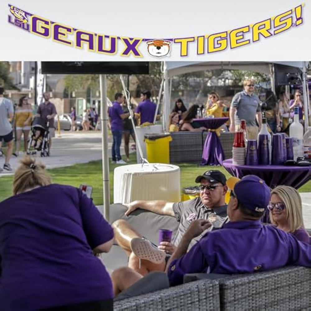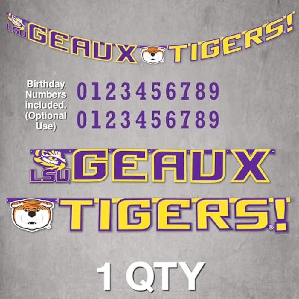 | LSU SPIRIT: Immerse yourself in the LSU spirit with our Geaux Tigers banner, a must-have among LSU party decorations for any die-hard fan. Perfect for LSU birthday party decorations, its generous length of 11.5 feet makes it the ideal centerpiece for tailgating, game day parties, graduations, and other LSU-themed celebrations. | | DURABLE: More than just a decoration, this banner, constructed from heavy cardstock paper and featuring the iconic mascot, Mike the Tiger, is a testament to your unwavering support for the LSU Tigers and a key piece of LSU outdoor decor. The quality materials ensure the banner's durability, making it perfect for tailgating party decorations, and allowing you to display your team spirit for many seasons. | | VIBRANT: As part of your LSU merch collection, this banner, featuring vibrant LSU purple and gold colors, along with the image of Mike the Tiger, instantly livens up any party or event. The striking colors and design make it a standout piece among LSU party decorations, ensuring it catches the eye of every guest. | | CONVENIENT: Included with the banner are two strings for easy attachment, making it a convenient choice for LSU birthday party decorations that you can display just about anywhere. The convenience of the strings means you can quickly and easily set up your LSU outdoor decor, whether at home or on the go. | | PERSONALIZABLE: Adhesive numbers are also included with the banner, making it a versatile addition to your tailgating party decorations, giving you the freedom to personalize it for any occasion. Whether it's a graduation year, record, national tournament, anniversary, or birthday, this piece of LSU merch lets you celebrate in true LSU style. | |