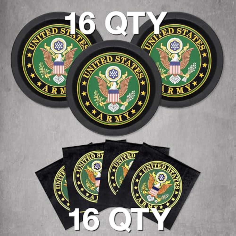 | OFFICIALLY LICENSED U.S. ARMY CREST Signifies Pride in serving as an Enlisted Soldier or Officer in the U.S. Army!! Perfect for all Official Army events. Honor your Loved One who is active or a veteran at Birthdays, Fathers/Mothers Day, Welcome Home, Retirements or a Party just for the fun of it! Also, Great for Kids Army or Military-Theme parties. | | 16 LG. PAPER PLATES 9 in. Dinner plates; perfect for entrees, picnics, desserts and plenty more. Sturdy Construction will hold up under a major food load. | | 16 LG. NAPKINS- Luncheon Napkins printed with vibrant graphics. | | CELEBRATE - Your Army event or person with the Real Deal - Licensed, United States Army party supplies | | FIND MORE - Find more US Army items in the Havercamp Store (link above), including: Cups, Balloons, Gift Bags, and Tablecovers. | |