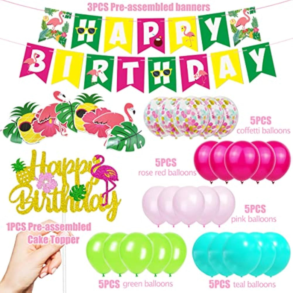 | Looking For Something Special To Add More Atmosphere To Your Summer-Themed Baby Shower Or Birthday Party Our Flamingo Happy Birthday Party Pack Will Be Your Best Choice! Perfect For Flamingo Pineapple Aloha Hawaii Or Any Summer-Themed Birthday Party Photo Prop And Any Events You Want. Nothing Is Better Than Our Kit With A Variety Of Summer Elements. Let'S Thrill Your Guests Wherever The Celebration Occurs! | | Pre-Assembled - Our Flamingo Happy Birthday Banners Are Made Of Premium Cardstock With Quality Colorful Printing. The Cake Topper Is Made Of Double-Sided Glitter Card Stock With Food-Grade Paper Sticks, Glitter Won'T Wind Up On Your Cake. Both The Cake Topper And Banners Come Pre-Assembled. Help You Effortlessly Create A Beautifully Unique Party For Your Occasion | | Gorgeous Party Packs - You'Ll Get 1Pcs Cake Topper(Measures 7.5" X 5.2"), 3Pcs Banners, 5Pcs Pink Balloons(12"), 5Pcs Light Green Balloons(12"), 5Pcs Teal Balloons(12"), 5Pcs Rose Red Balloons(12") And 5Pcs Confetti Balloons(12") , 29Pcs In Total. | | Original Design By - Our Party Supplies Have Been Carefully Handmade And Crafted. We Specially Design Multiple Elements(Flamingo, Pineapple, Hibiscus, Etc.), To Add More Fun And Make Your Party More Interesting. These Set Of Decoration Items Can Help You Light Up The Beautiful Night And Make This An Unforgettable Moment For Your Kids, Yourself, And Your Family, All Your Love | | - If You Are Unsatisfied With Your Purchase Of Our Flamingo-Themed Birthday Party Packs, You Can Have A 100% Refund Without Conditions | |