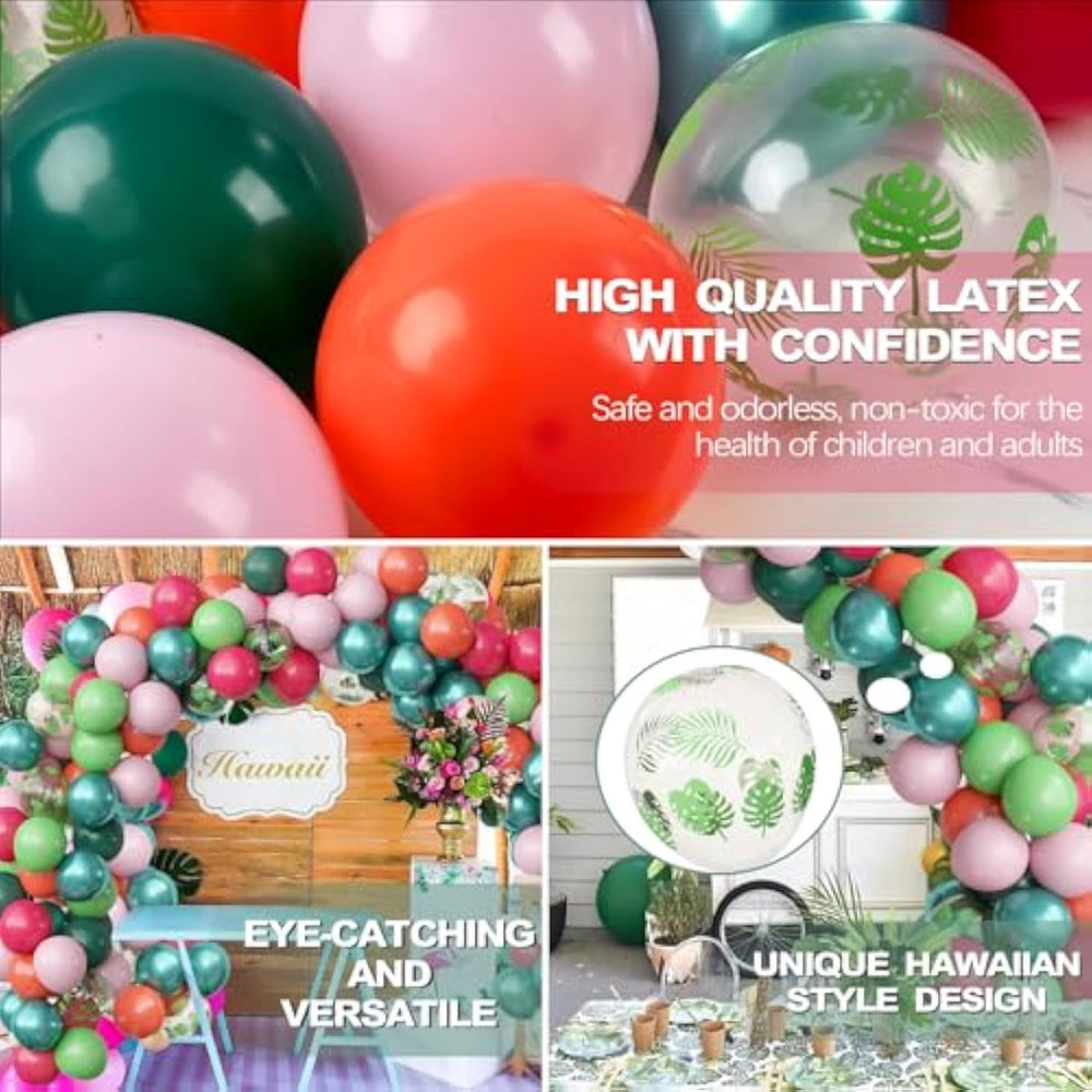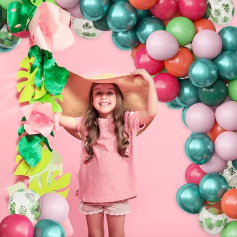 Bring the spirit of Hawaii to your party with our Complete Hawaii Balloon Set. This tropical balloon set includes 6 palm leaf balloons, 10 green balloons, 10 metallic green balloons, 10 light green balloons, 10 light pink balloons, 10 hot pink balloons, and 10 blush pink balloons, along with 2 green balloon ribbons. Designed with a vibrant tropical luau theme, these balloons feature lively palm leaves and a mix of colors that capture the essence of a Hawaiian luau. Perfect for inflating with either helium for floating or air to decorate walls, ceilings, and doorways, these balloons are versatile for a variety of occasions, including Aloha Moana birthdays, tropical parties, Hawaiian luau baby showers, and summer beach-themed events. Add a splash of fun and color to your celebration with these charming Hawaiian-inspired decorations.