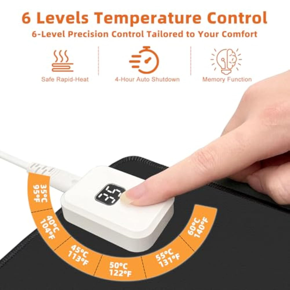 | Fast Heating Large Desk Pad??: This ??Heated Desk Mat?? (31.5"X13") Provides Expansive Space For Hands, Mouse, And Heat-Resistant Items, Creating A ??Refined Office Workspace??. With 95% Heating Coverage, It Delivers ??Uniform Warmth Distribution?? And Achieves ??Instant Heat In 10 Seconds??, Transforming Your Desk Into A ??Warm Workstation?? For All-Day Comfort. | | Safe And Eco-Friendly Materials?:Experience The Comfort And Safety Of Our ??Heated Desk Pad??. This Premium ??Leather Desk Mat?? Features A ??4-Layer Safety Design?? (Protective Film, Waterproof Pu Leather, Heating Element, Anti-Slip Bottom) With Certifications (Ce, Fcc, Rohs). It Also Functions As A Reliable ??Heated Mouse Pad?? For Targeted Warmth. The ??Desk Pad Mat?? Includes An Over-Current Protection Device For Peace Of Mind Against Electric Shock. Its ??Waterproof?? Surface Protects Your Desktop From Splashes, Ink, And Other Liquids Permanently. Maintenance Is A Breeze – It’S ??Easy To Clean??. | | 6-Level Heating Health-Conscious Design??: Our Premium ??Heated Mouse Pad?? Features ??6 Heating Levels?? (95?/35°C, 104°F/40°C, 113°F/45°C, 122°F/50°C, 131°F/55°C, 140°F/60°C). This ??Fast-Heating Desk Pad?? Warms Up Your Workspace Within 10-15 Seconds, Providing Comforting Warmth Anytime, Anywhere. Perfect As A Cozy ??Desk Mat For Winter??, It Boosts Comfort And Work Efficiency During Cold Months. Designed With Your Well-Being In Mind, This ??Ergonomic Mouse Pad?? Includes A Helpful Feature: After One Hour Of Continuous Use, An Indicator Light Flashes 1 Minute As A Gentle ??Health-Conscious Design?? Reminder To Take A Well-Deserved Break. | | Timed ??Auto Shut Off?? And Memory Function: The ??Heated Mouse Pad?? Will Automati