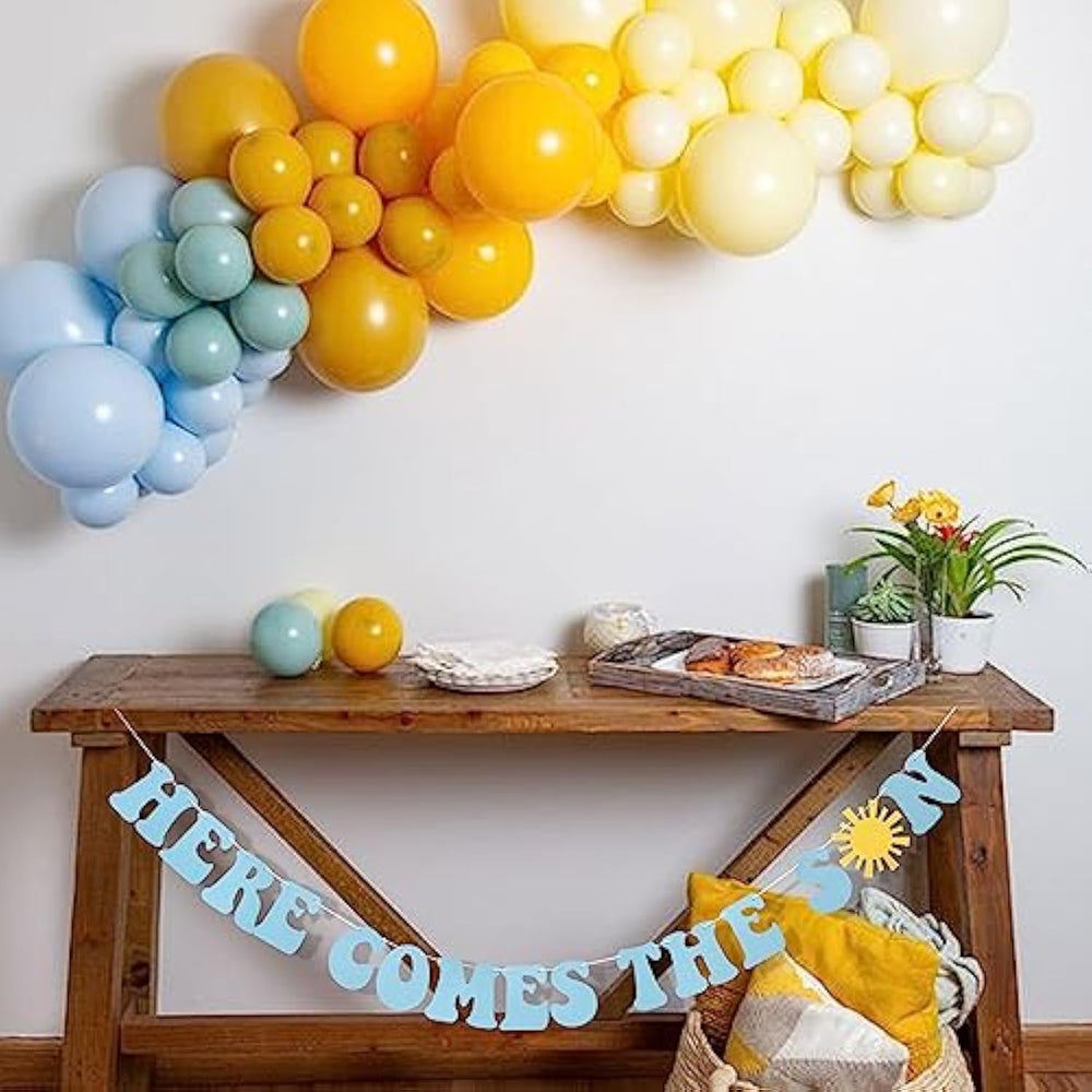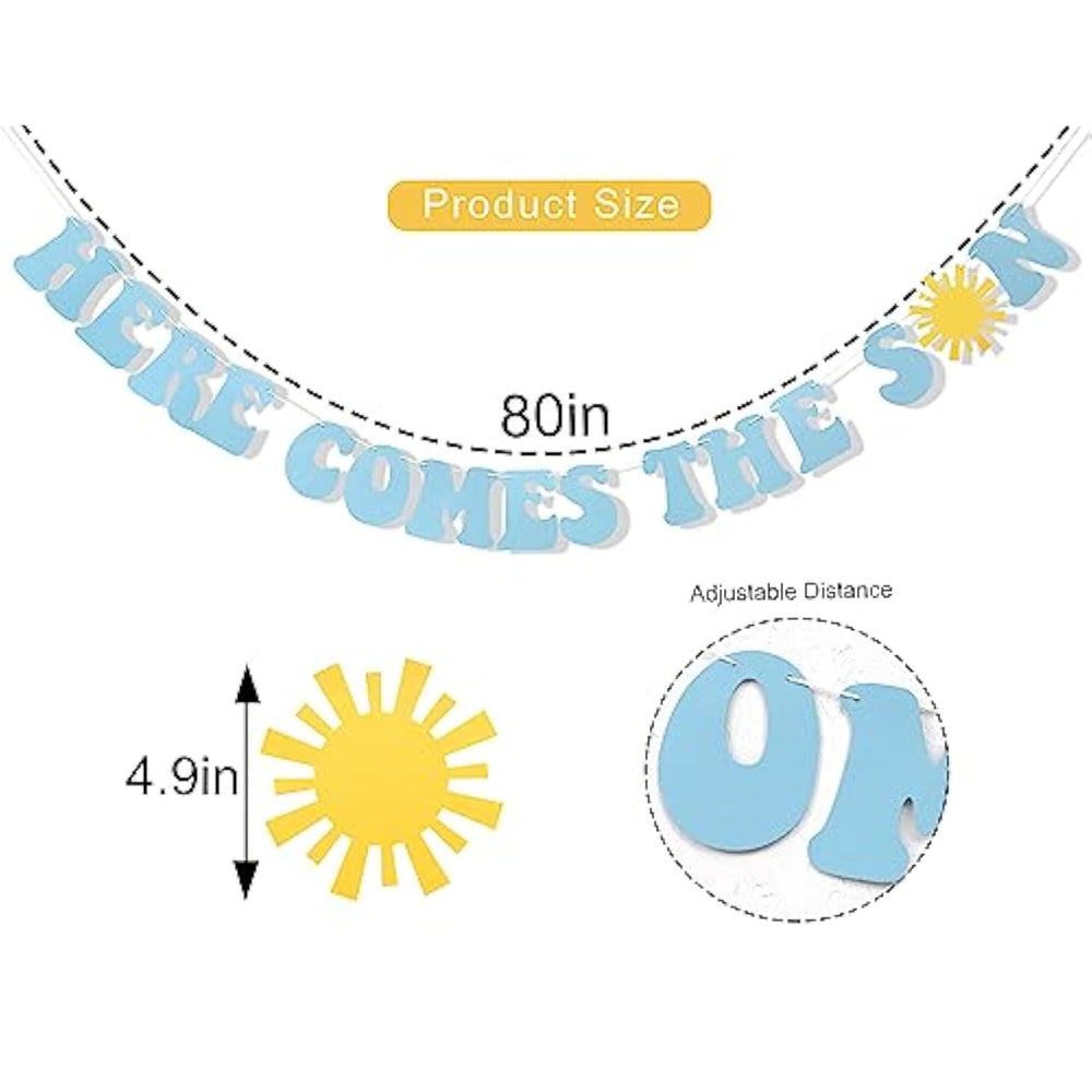 | Baby Shower Decor: Boho Sunshine Baby Shower Party Deco | | Retro Sun Party: Sun Banner For Baby Shower | | Blue Boy Or Girl Baby Shower: Here Comes The Son Banner | | Heavy Blue Cardstock: Backdrop For Cake Smash Or Baby Shower Photo Shoot | | Assembled Ready To Use: Rope And Needle Included For Easy Assembly | |