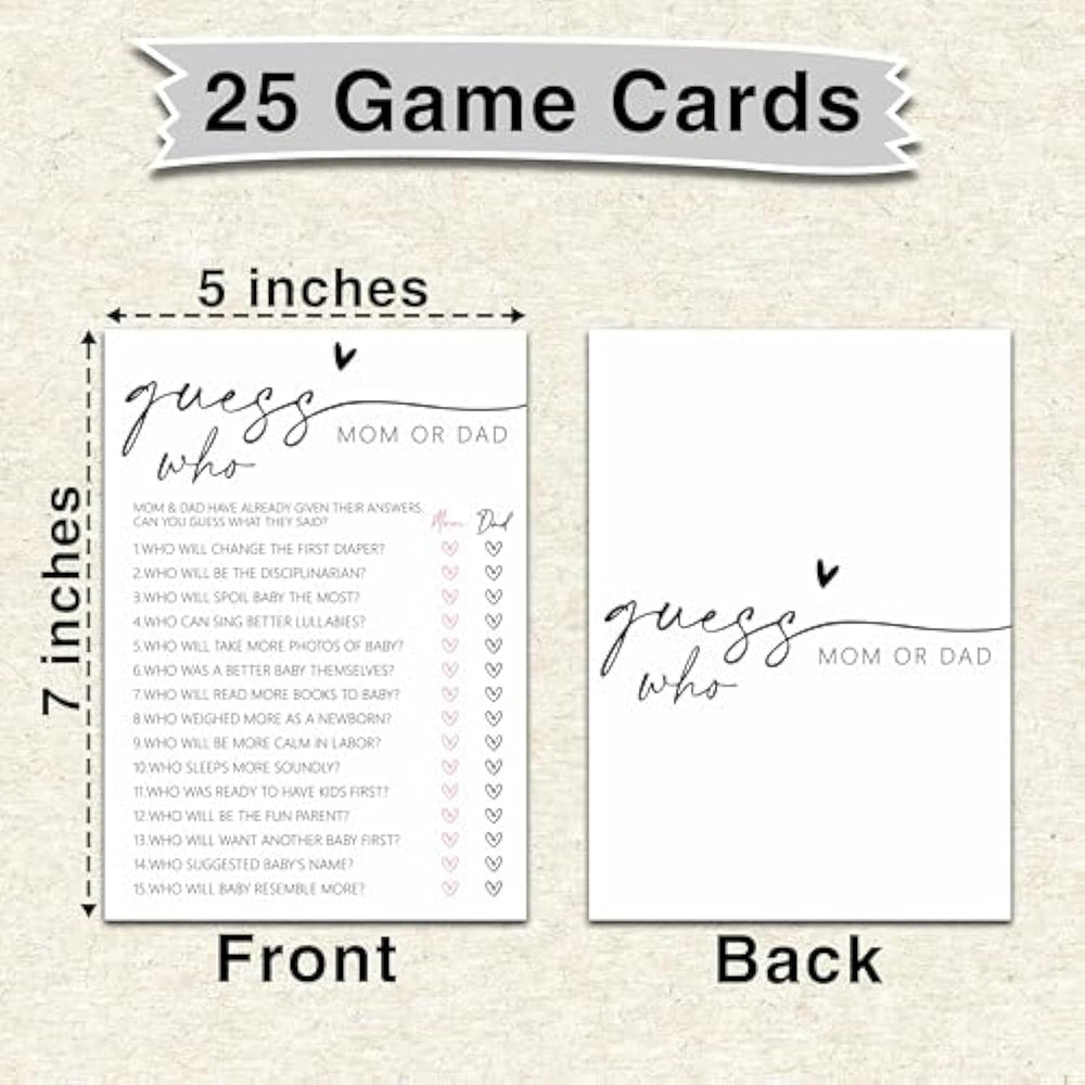 | Design: You Will Receive A Set Of 25 Game Cards, Each Printed On Both Sides. These Beautifully Designed Cards Are Perfect For Adding Fun And Laughter To Your Baby Shower. | | Dimensions: Each Baby Shower Game Card Measures Approximately 5 X 7 Inches, Providing Plenty Of Space For Guests To Participate. | | Material: Made From Durable Coated Paper, These Game Cards Are Easy To Write On And Built To Last, Ensuring A Smooth And Enjoyable Experience For Everyone. | | Party Supplies: These Baby Shower Game Cards Are Simple To Use And Perfect For Engaging Your Guests. Ideal For Gender Reveal Parties Or Baby Showers, This Game Set Will Keep Everyone Entertained And Involved Throughout The Event. | |