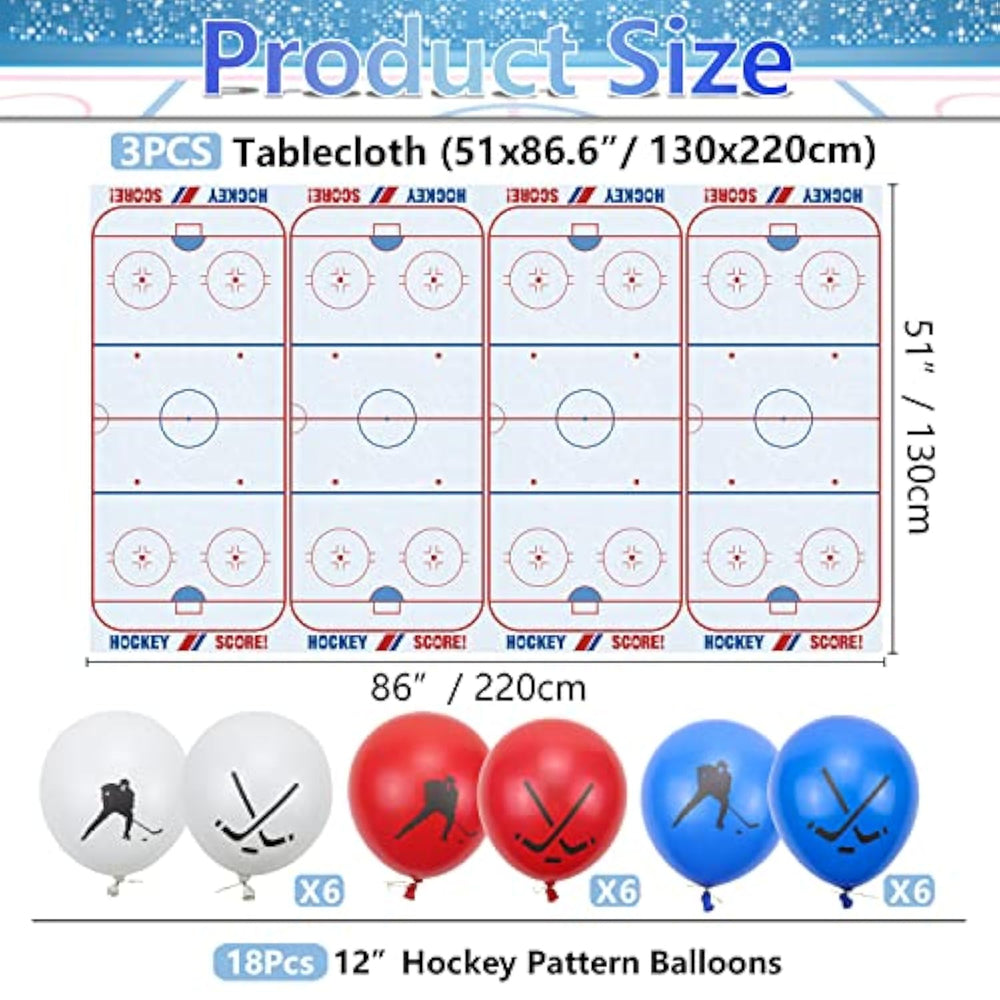 | Hockey Theme Party Package Includes: 3 X Hockey Tablecloths(51X87"/130X220Cm), The Rectangular Table Cover Is Big Enough For Covering Most Tables, And 18 X Hockey Pattern Balloons (6 Blue, 6 Red, 6 White, 12 Inches / 30Cm). | | Quality Material: The Ice Hockey Plastic Tablecloth Is Made Of Quality Pe Plastic, Strong And Durable, The Hockey Balloon Is Made Of Latex, Waterproof And Stain Proof, Safe And Reliable To Use, And Not Easy To Tear And Fade. | | Cute Hockey Theme Design: Hockey Tablecloth Printed With Clear And Cool Hockey Rink Patterns, This Would Be The Perfect Table Decoration For Your Ice Hockey Theme Party. Besides, This Hockey Party Decorations Package Comes With 18 Hockey Pattern Latex Balloons, Which Will Help You Create A Happy Festival Atmosphere. | | Easy To Clean: You Can Use A Wet Cloth Or Tissue To Remove The Dust Or Stains Remaining On The Hockey Birthday Tablecloth Easily During The Party Or Just Throw The Disposable Tablecloth Away After The Party, Which Saves You A Lot Of Time In Cleaning. | | Widely Applicable: These Hockey Party Decorations Could Be Used To Hockey Theme Birthday Party, Ice Hockey Game Day, Kid'S Or Hockey Lover'S Birthday, Holiday Parties, Bbqs, Indoor And Outdoor Events, Or Any Other Sports-Themed Event For Kids And Adults. | |