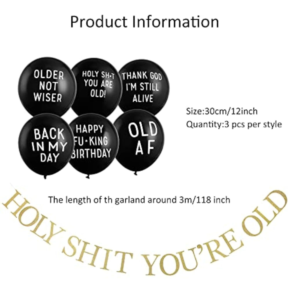 | [Humorous Designs] Adult Birthday Party Balloons And Banners Feature A Fun And Unique Design That Will Add A Touch Of Humor To Any Celebration. Package Includes A Holy Shit You'Re Old Banner And 18Pcs Risky Black Humor Balloons (6 Offensive Words, 3 Balloons Each) | | [Express Your True Feelings] Don'T Hide Your True Feelings At A Friend'S Birthday Party, Express Them With These Insulting Balloons That Will Surely Make A Statement. | | [Perfect Gift Idea] The Insulting Balloons Make For A Perfect Gift For Your Funniest And Most Humorous Friends Who Enjoy Dark Humor. | | [High-Quality Material] Made From Durable And High-Quality Materials, These Balloons Are Designed To Last For Days While Maintaining Their Shape And Color. | | [Versatile Use] These Fun And Unique Balloons Are Perfect For Birthdays, Anniversaries, Work Parties, And Other Occasions Where You Want To Add Some Excitement. | |