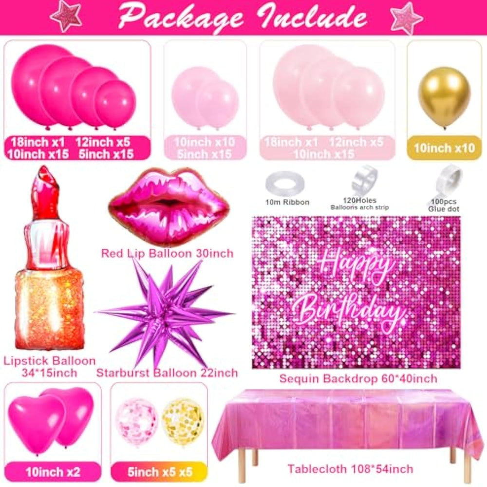| Hot Pink Birthday Party Decorations - We Have Carefully Prepared A Set Of Pink Birthday Party Decorations. It Includes 102 Latex Balloons (5"+10"+12"+18", 3 Colors, With Sequin Balloons), 4 Large Foil Balloons (Lipstick, Lip, Heart, Starburst), 1 Sequin Birthday Backdrop, 1 Laser Tablecloth; And Balloon Accessories (Glue Points, Balloon Chain, Ribbon). The Rich And Complete Accessories Can Fully Meet Your Needs, Suitable For Girls Or Women Of Any Age, Let'S Enjoy The Party Feast Together | | Pink Princess Birthday Party Decorations - Our Birthday Decoration Is Mainly Pink In Color, Equipped With Backdrop, Tablecloth And Foil Balloons, Which Can Help Every Beautiful Girl Or Woman Celebrate Birthday. Perfect Photo Backdrop And Props. Great For Girls Birthday Party Decorations, Birthday Decorations For Women, Hot Pink Birthday Decorations, Pink Balloon Arch Kit, Pink Balloon Garland, Birthday Decorations For Girls 1 2 3 4 5 6 7 8 9 10 11 12 13 14 15 16 Years Old | | High-Quality Materials - The Balloons Are Made Of High-Quality Latex Or Aluminum Foil, Which Are Safe And Non-Toxic, Have Extremely Low Defective Rate, Are Airtight And Last A Long Time. Sequin Backdrop Is Made Of High-Quality Vinyl Material, And The Pattern Is Clear And Non-Reflective. Laser Tablecloth Is Made Of High-Quality Pe, Which Is Waterproof And Easy To Clean. All Accessories Comply With American Toy Standards, So There Is No Need To Worry About Safety And Quality Issues | | How To Use - Backdrop Has Holes And String For Easy Hanging; The Tablecloth Can Be Used Directly, Saving Time. We Recommend Preparing A Balloon Inflator To Inflate The Balloon To 80% Of Its Size, To Prevent Explosion Caused By Over-Inflation. We Have Also Prepared General Accessories For Balloons To Help You Diy Pink Cowgirl Balloons Garland Arch Kit Better And Faster. (If You Don'T Have Any Experience, Please Study Online In Advance, We Believe You Can Do Better.) | |