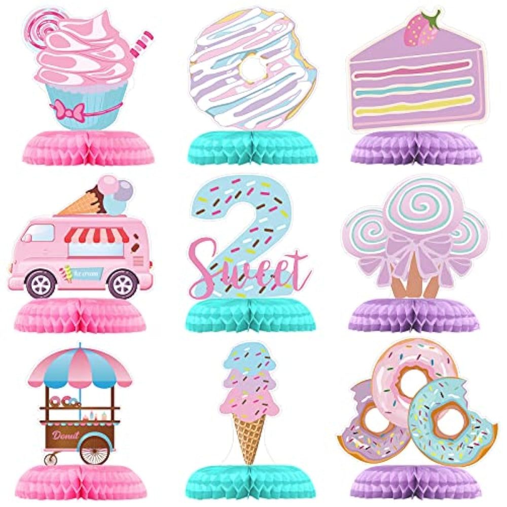 Package Includes: you will get 9 pieces of donut two sweet birthday decorations table honeycomb centerpieces in 9 different styles, which are very suitable for your kid's donut two sweet birthday party supplies | Suitable Size: the pink, blue and purple honeycomb bases are approx. 15 cm/ 5.9 inches, and the cute patterns are approx. 18 cm/ 7.09 inches, right size for tabletop decoration at party or home, easy to get your guests' attention | Safe and Sturdy: our donut 2nd birthday table decorations are made of quality paper material, safe and reliable, light but sturdy, with clearly printed patterns, not easy to fade, which can be applied for a long time and give you a good user experience | Charming Design and Color: these donut birthday party decorations are designed with rich and varied patterns, such as donut, ice cream, strawberry and lollypop, with the words 2 Sweet written on it, which will be loved by your kids and make your party sweet and eye catching | Donut 2nd Birthday Theme Table Party Supplies: these donut table centerpieces are ideal for donut party, girl 2nd birthday theme party decorations, baby shower, summer party, friends gathering and so on, and also suitable for you to take beautiful photos |