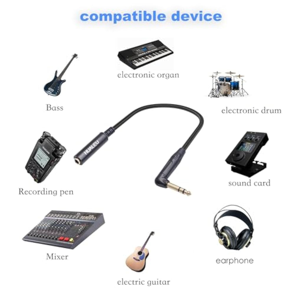 Fiber Braided Protection: The Right Angle 6.35Mm Male To Female Trs Stereo Audio Cable Is Equipped With A Fiber Braided Protective Mesh, Ensuring High Tensile Strength And A Long Lifespan. | | Reliable Gold-Plated Connectors: The Connectors Of This Cable Are Crafted From Gold-Plated Brass, Providing A Reliable And Corrosion-Resistant Connection, Ensuring Optimal Audio Transmission. | | Heavy-Duty Zinc Alloy Housing: The Plug'S Outer Shell Is Constructed From Heavy-Duty Zinc Alloy Through Precision Casting, Ensuring Durability And Longevity. | | 24Awg Oxygen-Free Copper Conductors: This Audio Cable Features 24Awg Oxygen-Free Copper Conductors, Along With Aluminum Foil And Copper Braided Shielding, Delivering Excellent Signal Transmission And Shielding From Interference. | | 4.5Mm Cable Diameter: With A Compact 4.5Mm Outer Diameter, This Cable Is Lightweight And Easy To Manage, Allowing For Convenient Usage And Storage. |