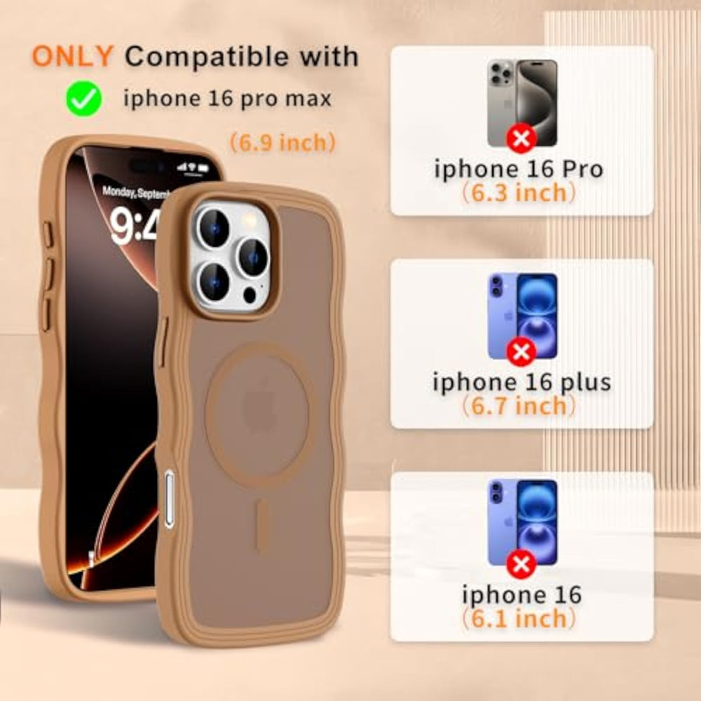 | Phone Case Fit For Iphone 16 Pro Max Only | | Fit For Magsafe: Built-In Magnetic Ring That Aligns Perfectly With Your Magnetic Accessories. Securely Snap On All Official Magnetic Accessories | | Military Grade Drop Protection: Built-In Shockproof Airbags In 4 Corners With A Tough Pc Matte Back And Soft Flexible Rubber Bumper,It Provides A Strong Buffer To Prevent Drops | | Cute Wave Frame Curly Design: All Cutouts Of Charging Port, Lens, And Side Buttons Have Been Measured And Calibrated Countless. Each Button Is Sensitive And Easy Access. Support Wireless Charging | | Super Magnetic Attraction: Powerful Built-In Magnets, Easier Place-And-Go Wireless Charging And A Secure Lock On Any Magsafe Accessory | |