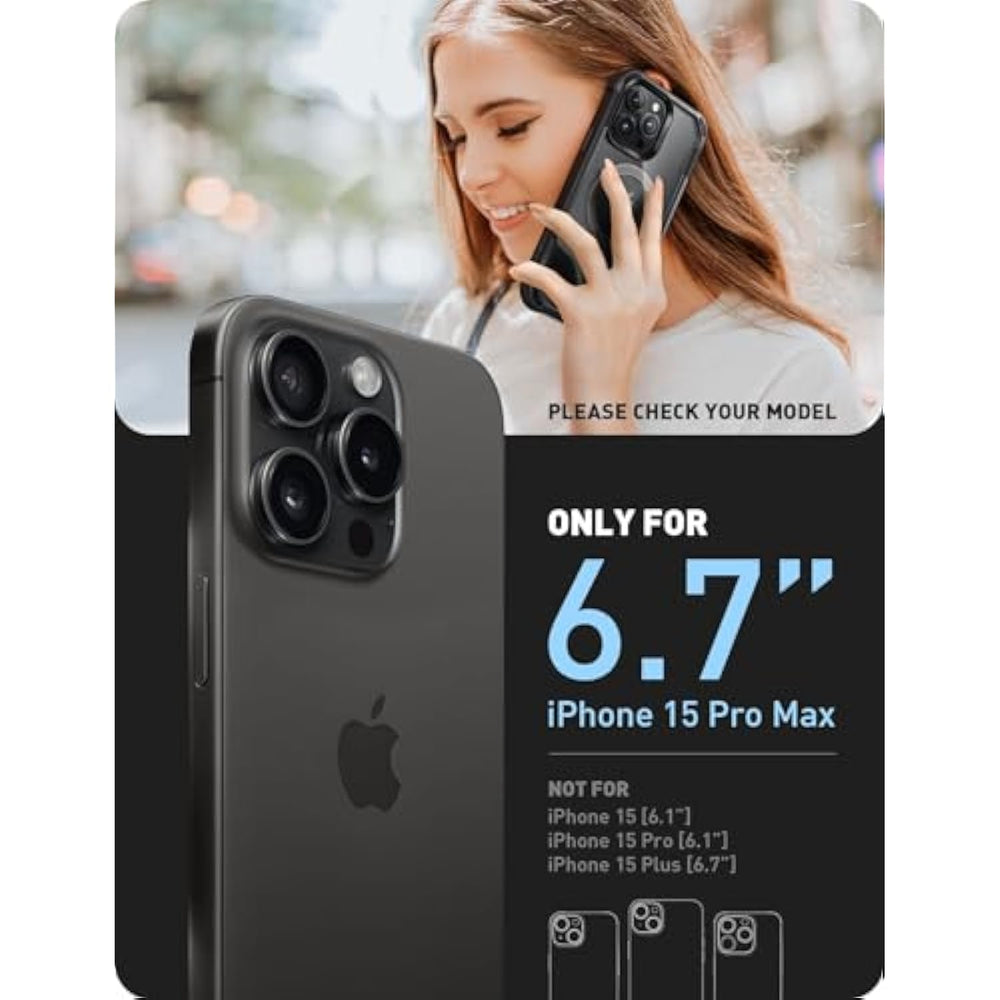 | Only compatible with iPhone 15 Pro Max (6.7 inch) 2023 edition. Compatible with MagSafe and most wireless chargers | | [Built in Screen Protector]: Built-in screen protector prevents scratches and cracks on the screen without compromising touch sensitivity | | [STRONGER MAGNETIC ABSORPTION]:Built-in 12x strongest N55 magnets allow faster and more efficient MagSafe wireless charging. It also works with the MagSafe wallet and magnetic car mount | | [CNET certified protection]: flexible TPU and polycarbonate materials provide 360° CNET certified protection against dust, dirt, drops or drops (CNET certified and drop test from 20 feet height) | | Raised bezels and precise cut: raised bezels keep your touch screen and camera lens free from harmful surfaces; precise cut and design allow easy access to all ports, sensors, speakers, cameras and all features | |