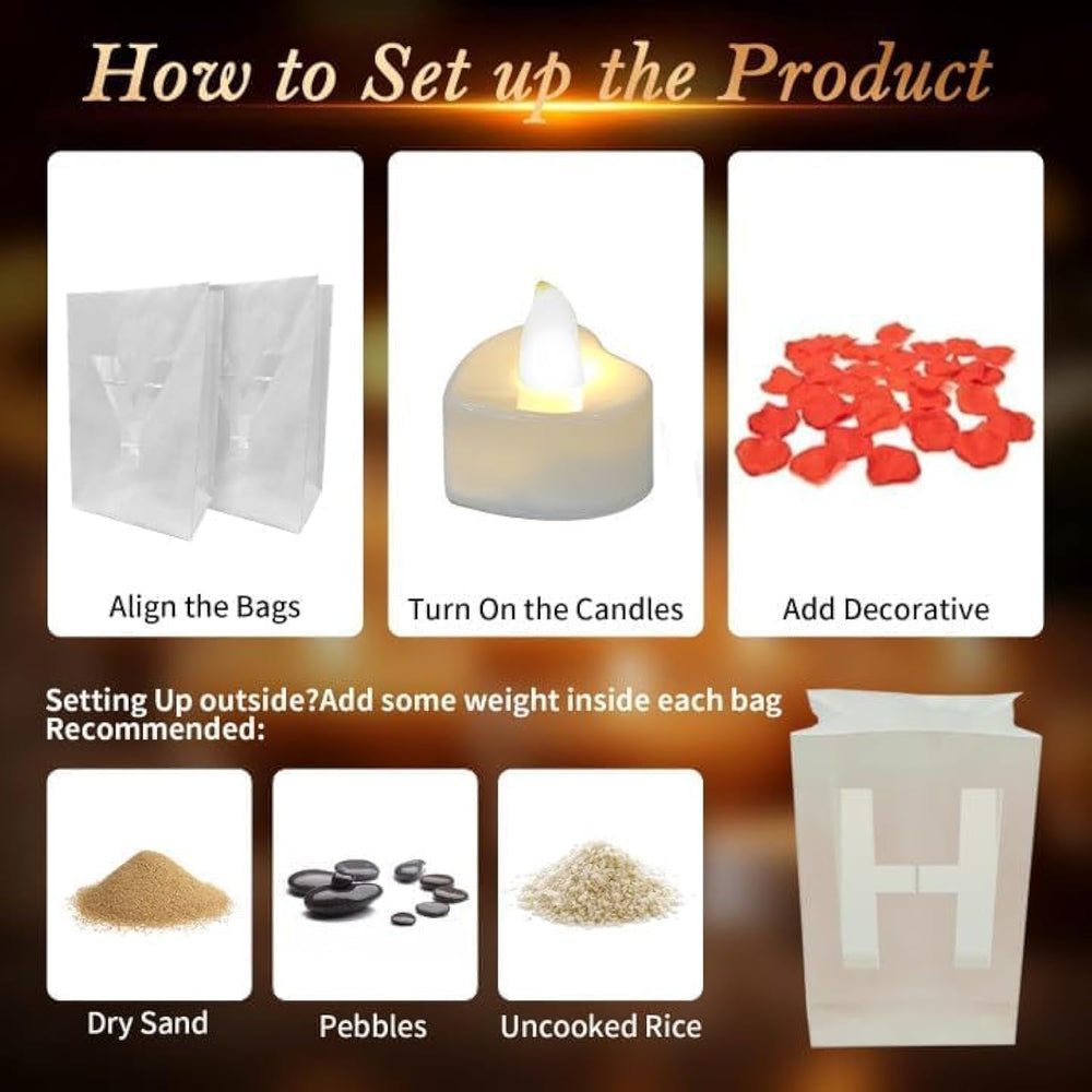 | Products Include: 8 Pcs X I Love You Letter Light Up Sign; 30 Pcs X Led Tea Lights; 1000 Pcs X Red Fake Rose Petals; 1000 Pcs X Pink Fake Rose Petals; 20 Pcs X Latex Balloons; 10 Pcs X Aluminum Film Balloons | | Easy To Use: Creating A Romantic Setup With Our “I Love You” Light Up Letters Is Effortless! Simply Place The Led Tea Lights Into The Luminary Bags To Instantly Illuminate Your Space. For Outdoor Use, Stabilize The Bags With Rocks Or Sand, Ensuring A Safe And Enchanting Display. | | Romantic Decoration: Transform Your Celebration Area Into A Magical Haven With These Charming Paper Bags. The Warm Glow Of The Tealights Beautifully Complements The Rose Petals, Setting The Perfect Romantic Backdrop For Your Special Moment And Captivating Your Loved One. | | Surprise Decoration: Make Your Expression Of Love Truly Memorable By Incorporating These Eye-Catching Light-Up Letters Into Your Celebration. The Combination Of Led Lights And Decorative Elements Will Elevate The Atmosphere, Surprising And Delighting Your Loved One And Leaving A Lasting Impression On Everyone Present. | | Wide Application: Our Versatile Candle Luminary Bag Decoration Kit Is Suitable For Various Venues, Whether It'S Your Living Room, Hotel, Waterfront, Or Bedroom. Use These “I Love You” Lights To Add A Touch Of Romance And Sophistication To Any Setting, Making It Ideal For Anniversaries, Proposals, Or Intimate Gatherings. | | Perfect For Any Celebration: Whether You'Re Planning A Surprise Proposal, A Romantic Anniversary Dinner, Or A Grand Celebration Of Love, Our “I Love You” Light Up Letters Are Essential For Creating Unforgettable Moments. Their Enchanting Glow, Paired With Latex And Aluminum Film Balloons, Enhances The Romantic Vibe, Making Them A Must-Have For A Complete And Memorable Celebration. | |