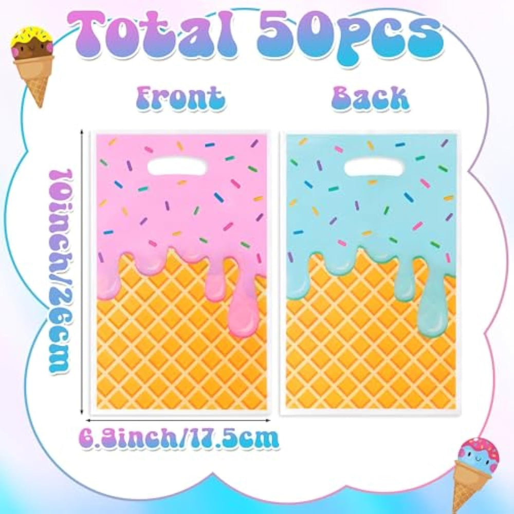 | Ice Cream Favor Bags: The Package Includes 50Pcs Ice Cream Plastic Party Bags, The Perfect Touch For Celebrating An Ice Cream Themed Birthday Party Or As A Gift Bag For Kids And Friends. Provides Enough For Your Party, Event, Or Everyday Use. | | Reliable Material: These Summer Ice Cream Goodie Bags Are Made Of Odorless Bopp Material, Which Is Strong And Durable With A Smooth Surface That Won'T Cut Your Hands. In Addition, They Are Designed With A Handle For Easy Carrying. | | Ice Cream Theme Design: Our Ice Cream Gift Bags Are Based On Sweet Pink And Blue, The Design Is Exquisite And Beautiful, Adding A Touch Of Elegance To Any Occasion. These Colorful Ice Cream Are Melting, Which Can Easily Create A Sweet Summer Atmosphere For Your Ice Cream Birthday Party. | | Suitable Size: Each Sweet Party Favor Bag Measures Approximately 10 X 6.3 Inches. Perfect Party Favor Bag Size, Large Enough To Hold Party Favors Or Small Gifts Such As Chocolates, Candy, Toys, Gifts, Cupcakes, Cookies, Snacks, And Other Party Favors. | | Wide Application: The Ice Cream-Themed Goody Bags With Handles Are Widely Applicable Not Only For Kids' Birthday Parties, Ice Cream Themed Parties, Wedding, Baby Showers And Other Summer Celebrations, But Also Applied As Gift Bags, Shopping Bags, Toy Bags, Party Gift Bags, Retail Bags, Commodity Bags And More. | |