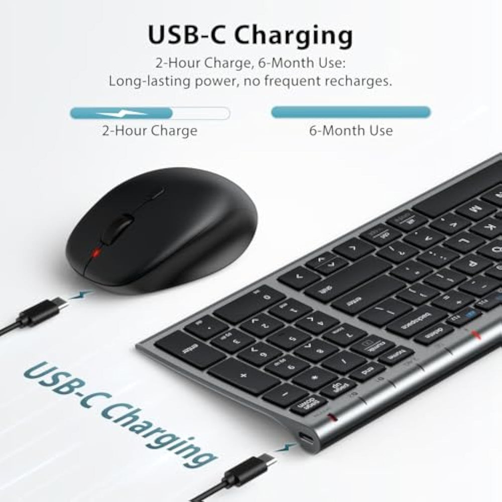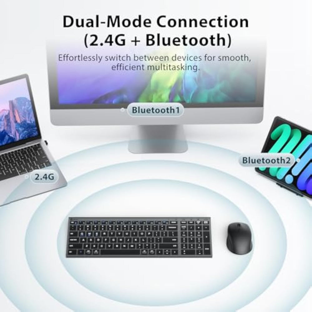 | Seamless Multi-Device Connection: Switch effortlessly between up to three devices with dual-mode Bluetooth and 2.4G wireless connection. The keyboard and mouse share a single receiver, ensuring easy setup and seamless device pairing. | | Universal Compatibility: Compatible with Windows, Mac, Android, iOS, and Chrome OS. Works seamlessly with devices including PC, laptop, MacBook, iMac, iPad, iPhone, tablet and smartphone. Easily pairs with your system, often without additional configuration. | | Compact Durable: Crafted from durable ABS and metal, this ultra-slim keyboard features a space-saving layout with 99 keys, including a full number pad. Its compact design efficiently utilizes desk space while ensuring full functionality. | | USB-C Rechargeable: Featuring a built-in rechargeable battery, a single charge provides at least 180 days of use, minimizing interruptions in your workflow. For added efficiency, The mouse enters sleep mode after 10 minutes (keyboard after 2 hours) and wakes with any key press. | | Low-profile Silent: The keyboard's scissor-switch design provides a laptop-like typing feel with quiet, tactile feedback, and a slight tilt for added comfort during extended use. The ergonomic mouse offers 4-level adjustable DPI (800-1200-1600-2400) for smooth and precise control. | |