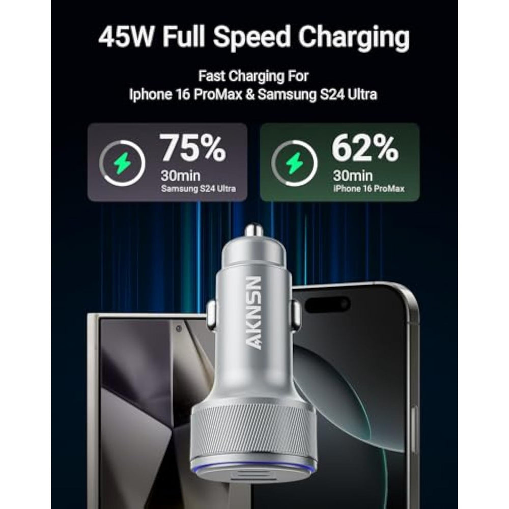 | 167.5W Simultaneous High-Speed Charging: The Fast Charging Car Adapter Can Charge Up To Three Devices At The Same Time, The C1 Port Up To 100W Power, The C2 Port Up To 45W Power, And The A Port Provides 22.5W Power, Enjoy The Journey And Save Your Charging Time. | | 100W Efficient Port: The Usb-C1 Port Delivers Up To 100W Of Maximum Power, It Can Quickly Charge Your Macbook Pro 16β And Other Devices Up To 45% In 30 Minutes. | | 45W Multi-Device Compatible Fast Charging: The Usb-C2 Port Delivers 45W Of Maximum Power, Which Provides Fast And Reliable Charging For Your Apple Mobile Phones, Android Devices, Samsung And More. | | Reliable Car Charger: The Car Charger Has A Built-In Smart Chip With Multiple Protections For Over-Current, Over-Voltage, Overheating And Short Circuit. Compact And Safe, Size 2.6*1.2*1.2In. | | What You Get: 1 * 167.5W Usb C Car Charger, 1 * 3.4Ft Usb-C To Usb-C Cable, And Complete After-Sales