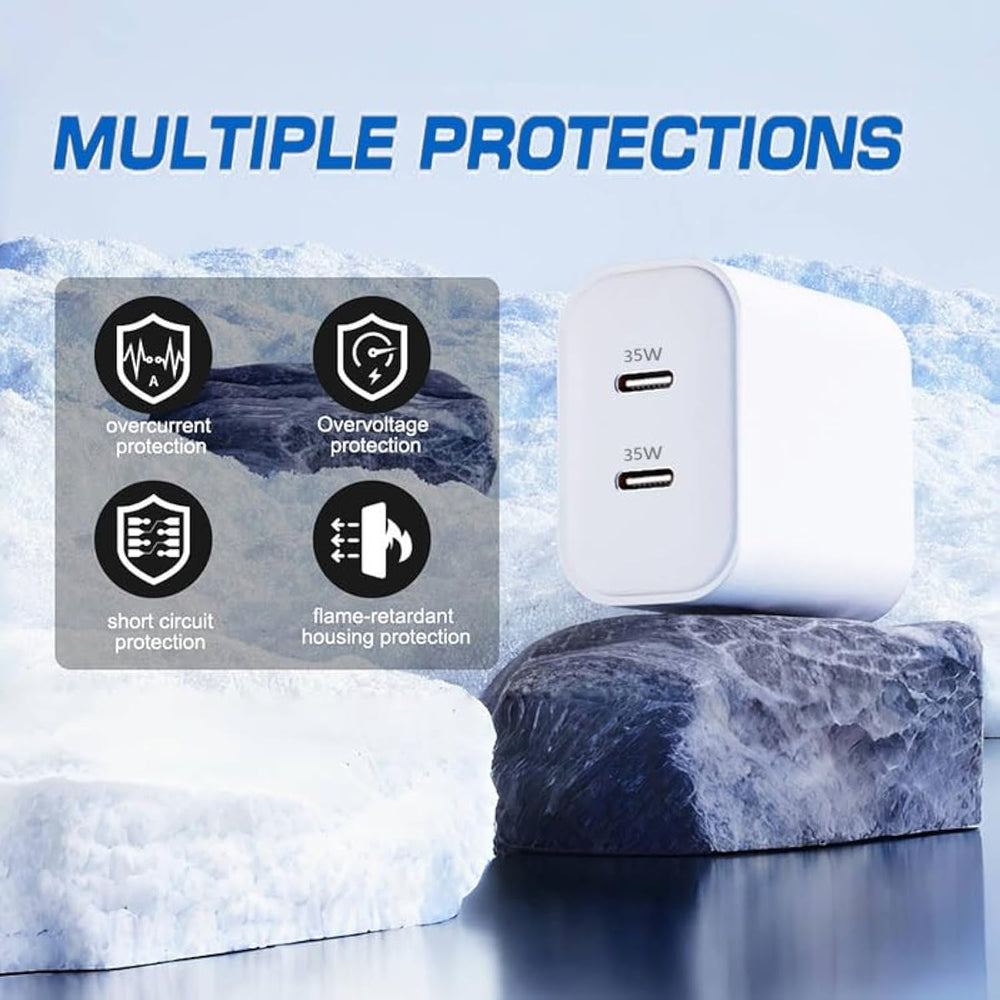 | ?35W Iphone 17 16 Charger Fast Charging? - The 35W Iphone 17/16 Fast Charger Usb C Block With The 60W 10-Foot Extra Long Usb C To Usb C Fast Charger Cable Provides A Maximum 35W Output Power, Charging The Iphone 17 16 Pro Max Up To 60% In 30 Minutes, 3X Times Faster Than The Original 20W Usb C Charger. And The 35W Charger Uses A Two-Port Design, Two Ports Can Quickly Charge Two Devices At The Same Time, Up To 35W, Up To 35W When A Single Device Is Connected. | | ?60W Usb C Iphone 17 16 Charging Cable? - The Iphone 17 16 Pro Max Charger Comes With A 10Ft Long C-To-C Charging Cable That Supports Pd 3.0 Fast Charging Speed Up To 20V/5A (100W), The Reversible Design Of The Cable Allows For Easy Insertion, It Also Achieves Efficient 480Mbps Data Synchronization.Tpe Flexible Wire Exterior + 100% Copper Core Combined Together, Can Withstand More Than 15000+ Bending Life, Will Not Break Easily.10 Feet Long, You Can Move Your Device While Keeping It Powered Up. | | ?Safe Reliable Iphone 17 16 Charger Block? - Our Usb C Iphone 17 16 Charger Fast Charging Prioritizes Safety With Its Comprehensive Protection System To Prevent Overvoltage, Overcharge, And Overheating. Equipped With Advanced Smart Chips, Intelligent Current Regulation To Meet Your Device Needs, Ensure Your Iphone17/Iphone16 Fast And Safe Charging Process. | | ?35W Charger Fast Charging Compatibility? - Extra Long Iphone 17 Usb C Charger Cable Is Fully Compatible With Iphone 17/Iphone 17 Air/Iphone 17 Pro/Iphone 17 Pro Max/Iphone 16/Iphone 16 Plus/Iphone 16 Pro/Iphone 16 Pro Max/Iphone 16E/Iphone 15/Iphone 15 Plus/Iphone 15 Pro/Iphone 15 Pro Max; Ipad Pro 13/11 Inch M4;Ipad Pro 12.9 6Th/5Th/4Th/3Rd,Ipad Pro 11 Inch 4Th/3Rd/2Nd/1St;Ipad Air 13/11 Inch M3,Ipad Air 13/11 Inch M2,Ipad Air 5/4Th;Ipad 11-Inch A16,Ipad 10Th;Ipad Mini A17 Pro,Ipad Mini 6Th. | | ?What You Get? - You Will Get 2 Pack 35W Iphone 17 16 Fast Charger Block 2 Pack 10Ft Iphone 17 16 Usb C To Usb C Charging Cable. If You Have Any Questions, Please Don'T Hesitate To