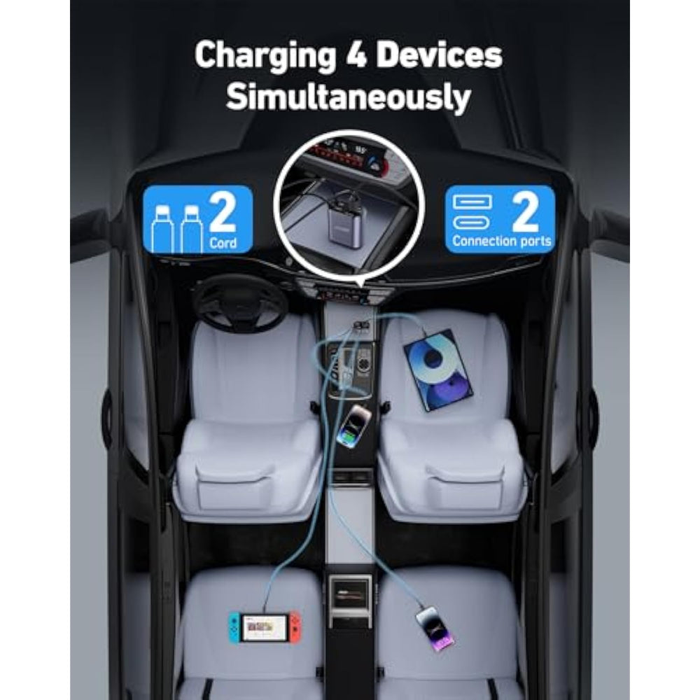 | ?Upgrade Smart Fast Car Charger?This Car Cigarette Lighter Usb Charger Made Of High-Quality Chips Ensures Efficient And Stable Charging Of Your Device,Charge Up To 4 Devices Simultaneously. Iphone Car Charger / Samsung Galaxy Car Charger Has Overcurrent, Overvoltage, Temperature Control And Short Circuit Protection Functions To Protect Your Device Battery From Overcharging Damage. Equipped With Usb And Usb C Universal Ports, Compatible With Iphone Series, Samsung Galaxy, Google Pixel Phones, Etc. | | ?Adjustable Length Retractable Cable Design?The Fast Car Charger Is Equipped With Double Lightning Retractable Cables, Their Maximum Stretching Length Is 31.5 Inches. Stretch To The Required Length And Then Release To Start Charging. After Charging, Continue Stretching For A Short Distance And Then Release To Automati