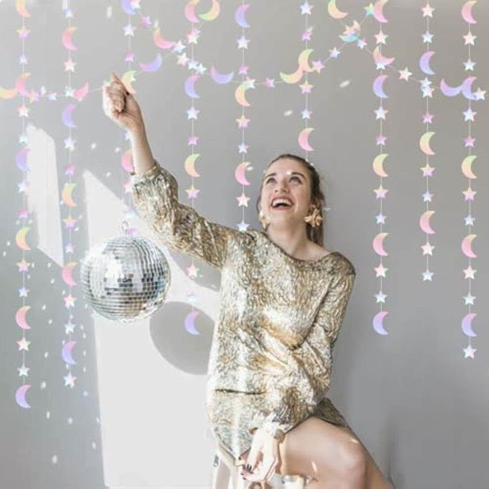 | ?Package Contains?4 Sets Of The Party Banner Garland,Each Is 15.7 Feet/ 4.8 Meters Long, Total Length Is 62 Feet/ 19 Meters.Every Banner Has 14Pcs Moon,28Pcs Star. | | ?Material?The Material Is Eco-Friendly Double Side Iridescent Silver.You Can Cut To Any Length You Want If You Need Shorter Length.The Moon And Star Are Cut Very Neatly. | | ? Easy To Hanging ?Just Open The Package To Hang It Directly No Need To Diy Again.Because They Have Been Sewn Together, Which Is Really Convenient For You. | | ?Using Occasion?They Are Perfect For Eid Decoration,Ramadan Mubarak Decor,Bridal Shower,Weddings,Anniversaries,Birthday,Twinkle Twinkle Little Star Decorations,Eid Mubarak Decor,Rose Gold Party Decoration,Iridescent Party Decorations,Disco,Neon,Holographic Party Decorations. | | ?Quality ?If You Ever Have Any Concern With Our Paper Garlands,Just