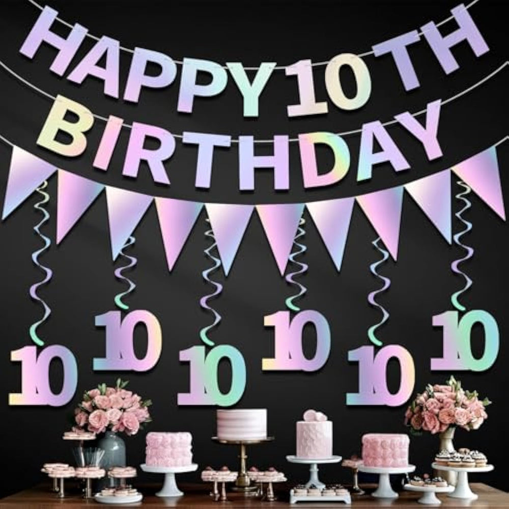 | [You Will Get]- Iridescent 10Th Birthday Decorations Kit, Including 1Pcs "Happy 10Th" Banner, 1Pcs "Birthday" Banner, 1Pcs Iridescent Triangle Banner, 6Pcs Number "10" Birthday Themed Hanging Swirls, Which Are Suitable For The 10Th Birthday Party. | | [Exquisite 10Th Design]- The Iridescent Glitter Numbers "10" Highlight The Birthday Theme, Create A Sweet And Romantic Atmosphere, And Attract Attention, Becoming The Fashion Center For The Tenth Birthday Celebrations. | | [Suitable Scene] - Suitable For The 10Th Birthday Theme Teenager Party For Girls Boys, This Banner Kit Works Well Indoors And Outdoors. Hang It On Walls, Fences, Balconies, Or Use It As A Photo Backdrop To Enhance Party Memories. | | [Easy To Assemble]- Each Of The Birthday Banners Is Pre-Strung, Saving A Lot Of Time, Easy To Hang, And Can Be Adjusted For Spacing. The Triangle Banner And Hanging Swirls Require An Easy Diy Setup, Which Comes Equipped With Installation Tools In This Set. | | [High-Quality Material]- 10Th Birthday Decorations Are Made From High-Quality, Thick Cardboard And Plastic, Lightweight And Not Easy To Fade, The Letters Will Not Slip Off Randomly, Reusable. 10Th Birthday Party Supplies Also Suit 10Th Birthday Gifts. | |