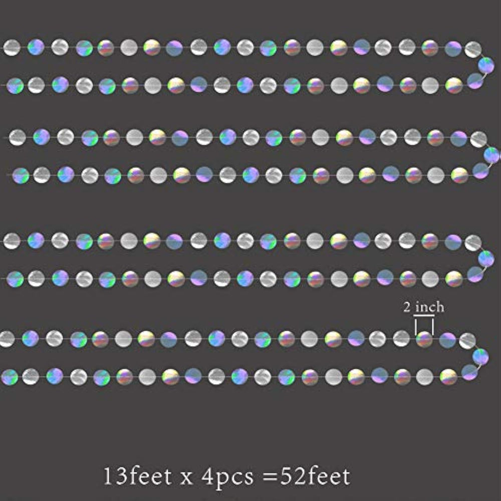 This iridescent garland set includes 4 pre-assembled strands, each 13 feet long, totaling 52 feet of shimmering decor. Made with 2-inch holographic circles, these garlands reflect dazzling colors that add a dreamy, festive touch to any space. Perfect for a wide range of themed events—like disco parties, birthdays, baby showers, bachelorettes, New Year’s Eve, and more—they bring sparkle to walls, ceilings, windows, and photo backdrops. Easy to hang and reusable, they’re a hassle-free way to elevate any celebration.