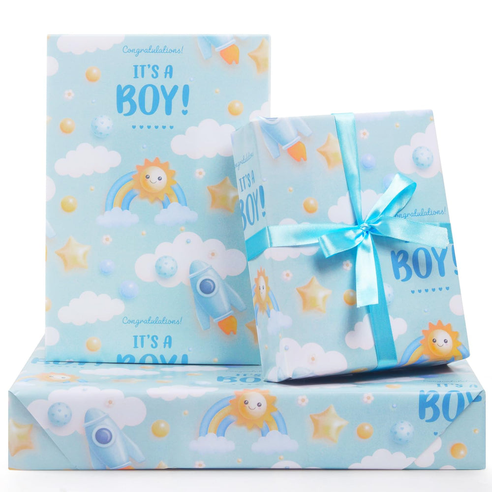 | ?? Special Baby Boy Design: This Adorable Light Blue Paper Gift Wrap Features Designs Of Rainbow Rocket Sun Clouds Stars Flowers With A "Congratulations It'S A Boy" Headline On It And More, Specially Designed For Little Newborn Baby Boys. ?? High Quality: 80Gsm Art Paper, Created With High Quality Art Paper Materials, Thick Enough That It Doesn'T Rip On Corners But Not Too Thick And Hard To Work With. ?? Perfect Size: Each Paper Sheet Is 20 X 28 Inches, It Is Large Enough To Wrap Different Sizes Of Gifts From Small To Medium To Jumbo; It Is Folded Into 1/4 Size And Sealed In Bags For To Prevent Damage. ?? Great Value Pack: The Package Includes 6 Large Sheets Gift Wrapping Paper. Also A Blue Silk Ribbon Is Included In The Package. Enough To Meet Your Individual Requirements For A Wrapped Gift. ?? Widely Applications: This Boy Wrapping Paper Is Perfect For Baby Boy Birthdays, Baby Showers, And Show Up To The Baby Shower With A Bunch Of Gifts For The Newborn Wrapped In Boy Baby Shower Gender Reveal Party Gift Wrap. ?? Kindly Reminder : The Birthday Wrapping Paper Is Folded When Delivery. The Crease Is Unavoidable. Please Use Scissors Carefully To Cut The Packet. If You Are Not Satisfied After Receiving It, Please Feel Free To