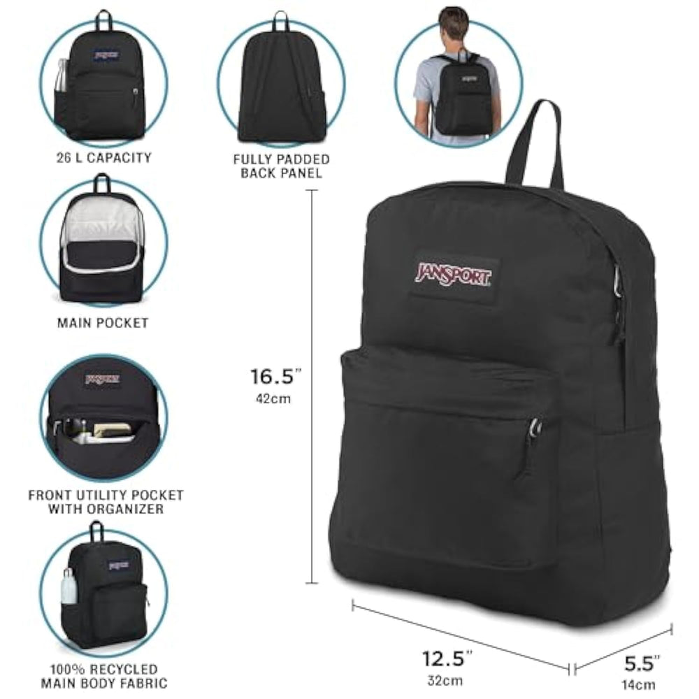 | Show Your OSU School Pride: Features an officially licensed NCAA college logo decorated with Ohio State Buckeyes embroidery. Backpack has a roomy main compartment measuring 16.5 x 12.5 x 5.5 inches. Spacious enough to carry your everyday essentials | | Laptop Protection: Interior padded 15-inch laptop sleeve safeguards your device from bumps and drops. This laptop backpack offers smart functionality, keeping your digital gear organized while on-the-go for work, school, travel or outdoor adventures | | Enhanced Comfort Accessibility: The adjustable straight-cut padded straps and fully padded back panel are designed to help carry large loads comfortably. Built with a sturdy web haul handle and zipper pulls with cord tabs for quick grab and easy access | | Organization Made Easy: The front utility pocket has a built-in organizer, plus a seamlessly integrated side bottle pocket. Great for keeping personal items like pens, keys, sunglasses and water bottles secure, on hand when you need them | | Durable Bags: JanSport has designed backpacks that last - main body is made of 100% Recycled Polyester (600 Denier). They go everywhere you go, see what you see, and carry whatever you need. Intended for students, commuters, professionals, and ages 13+ | |